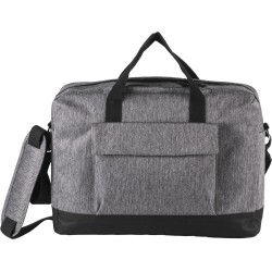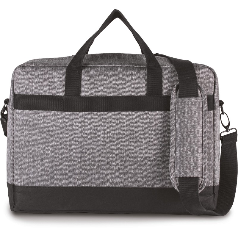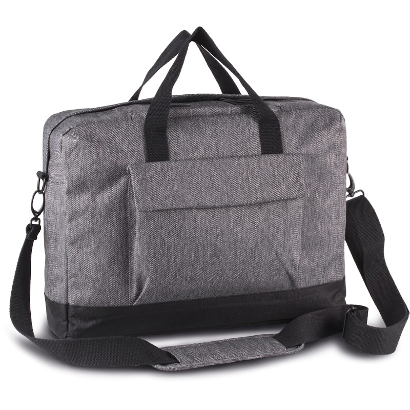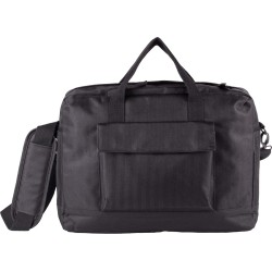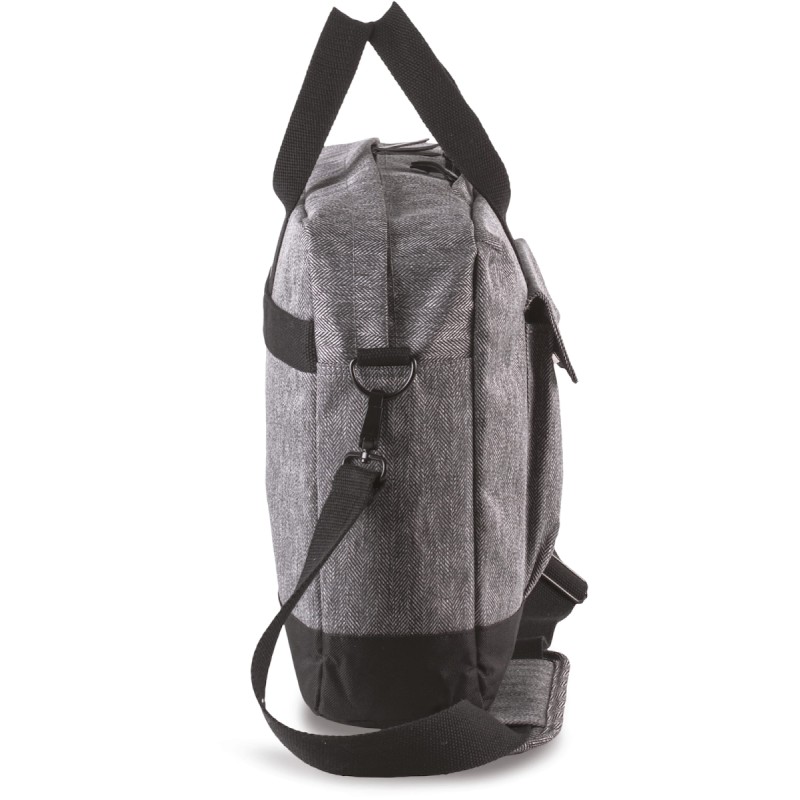 Sac porte-ordinateur en polyester, fond de sac contrasté en polyester 600D. Compartiment matelassé pour loger un ordinateur jusqu'à 15", et poche zippée matelassée pour insérer une tablette. 2 poches intérieures, 1 poche zippée sur le haut du sac pour loger téléphone portable, 1 poche devant avec rabat contrasté et boutons pressions. Passant au dos pour fixation trolley, lanière d'épaule amovible.
