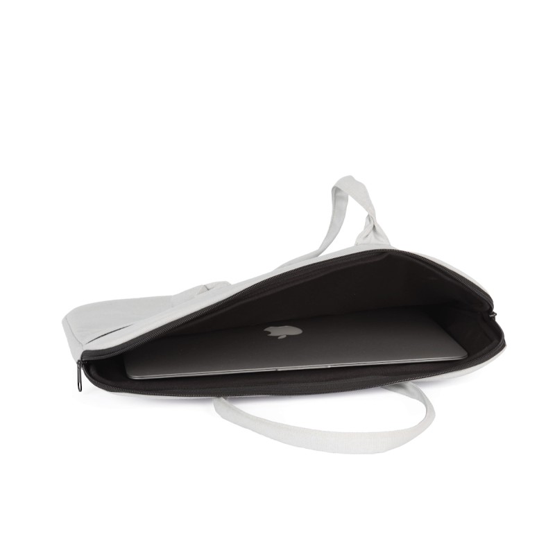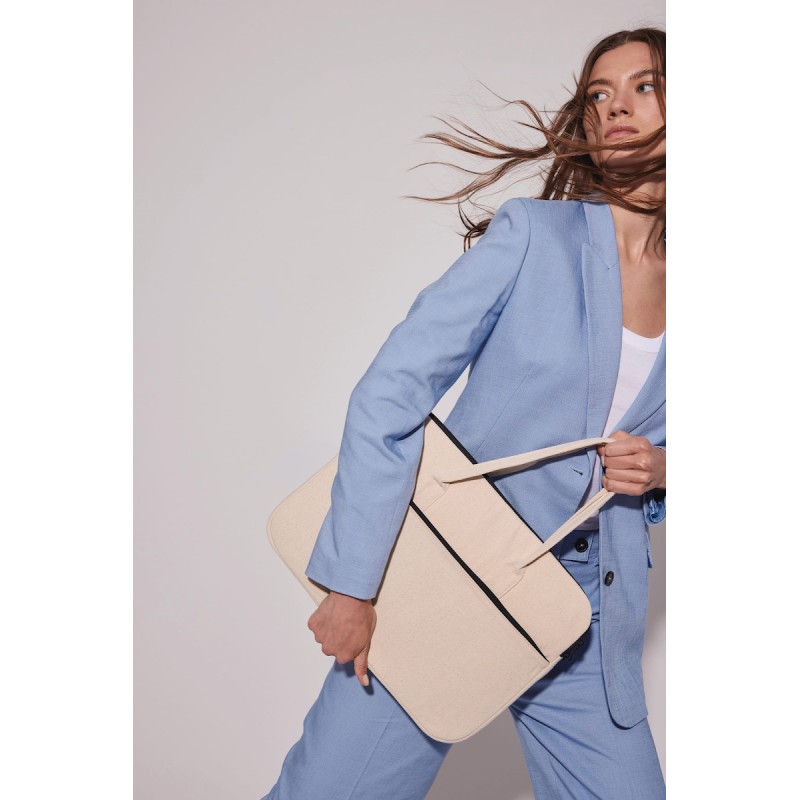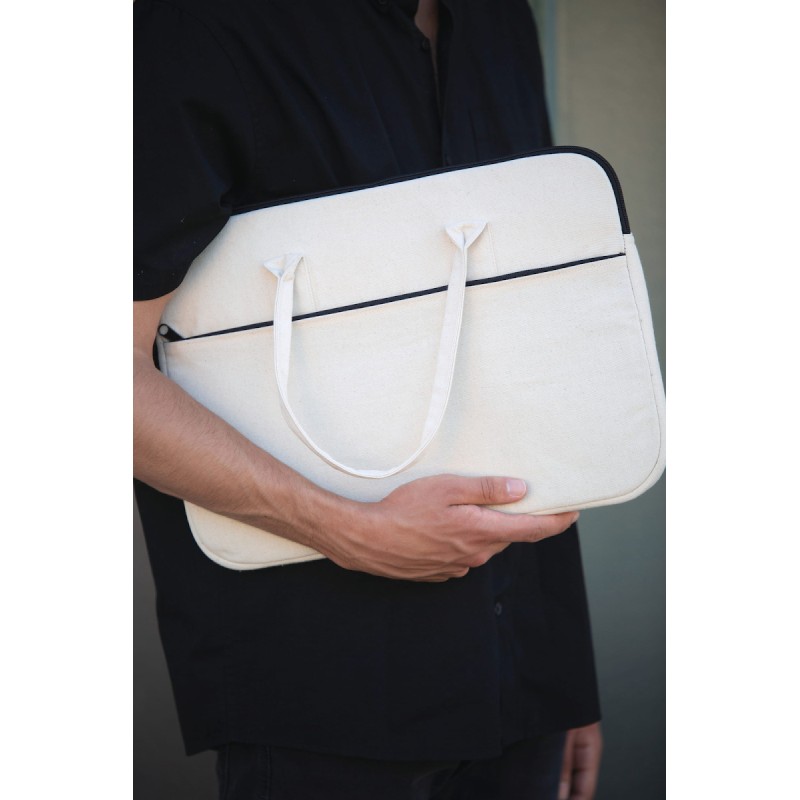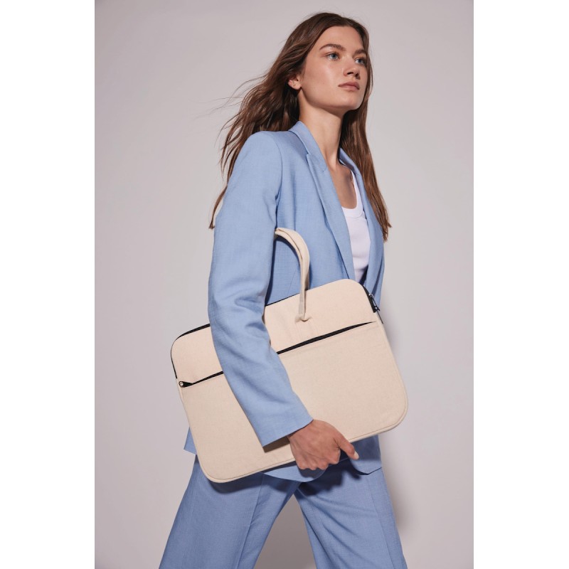 100% coton. Sac de travail en coton. Compartiment matelassé porte-tablette ou porte-ordinateur jusqu'à 15 pouces. Poche avant et arrière identique avec fermeture zippée pour faciliter la personnalisation des 2 côtés. Poignées réalisées dans le même matériau que le corps du sac.
