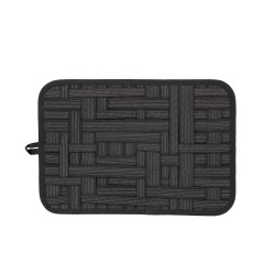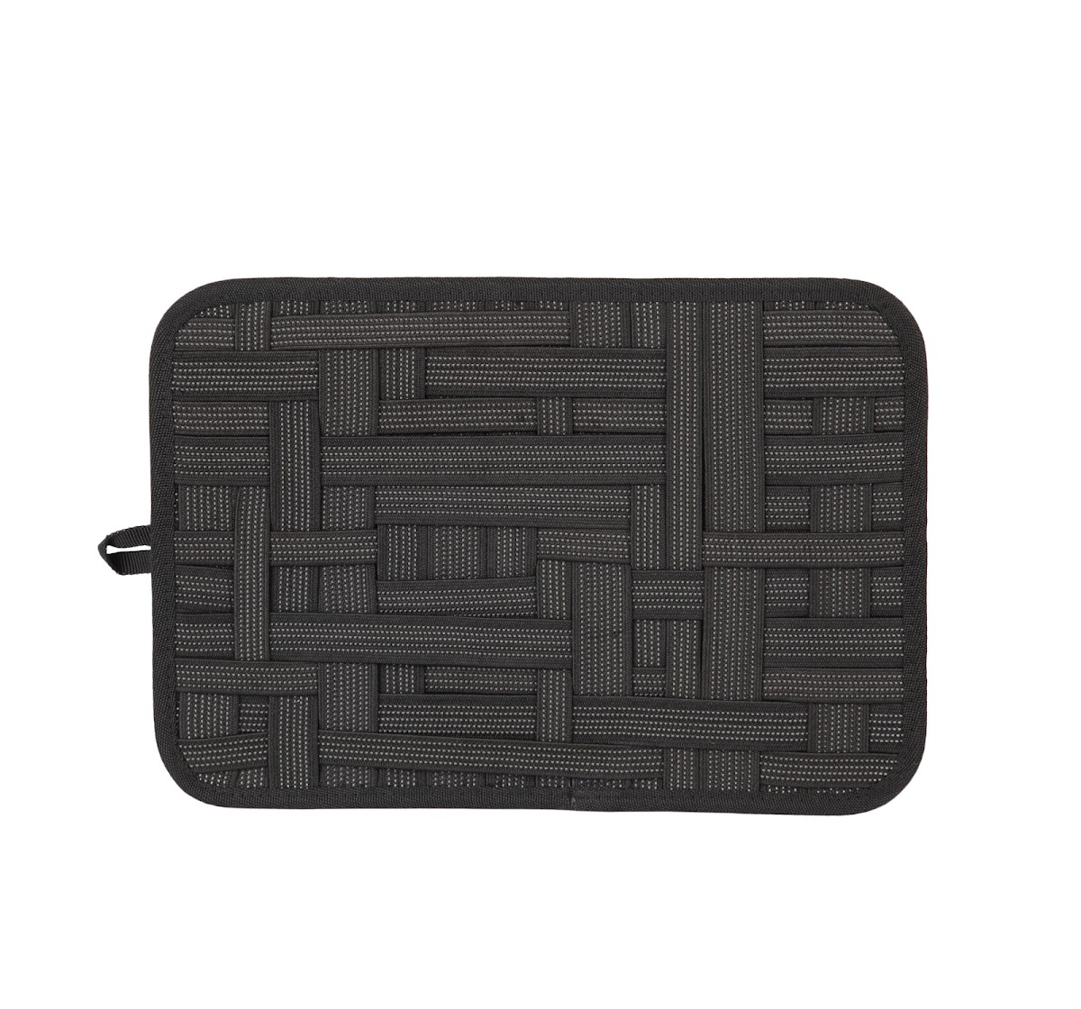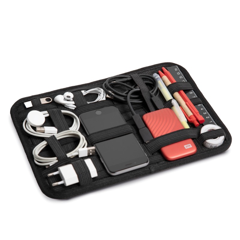 100% polyester. Tablette en polyester porte-câbles. Grâce à un système d'élastiques croisés de différentes longueurs, il est possible d'y ranger tous les câbles et accessoires de vos ordinateurs, tablettes, smartphones et tout autre appareil électronique. Facile à transporter, grâce à son format A4, elle rentre dans la plupart des sacs à dos et sacs de travail. Poche arrière avec fermeture zippée facilement personnalisable pour ranger les petites cartes.