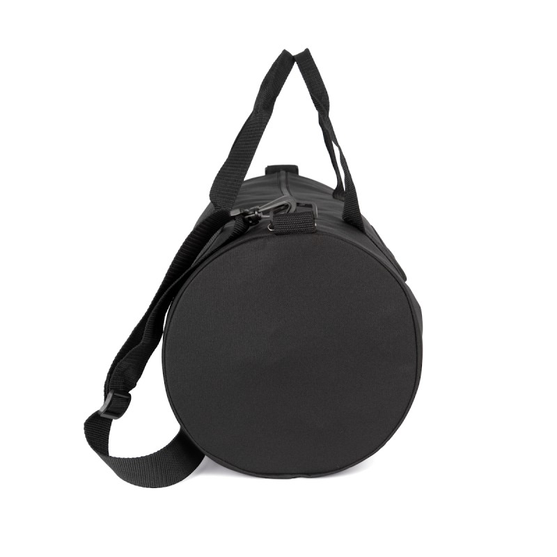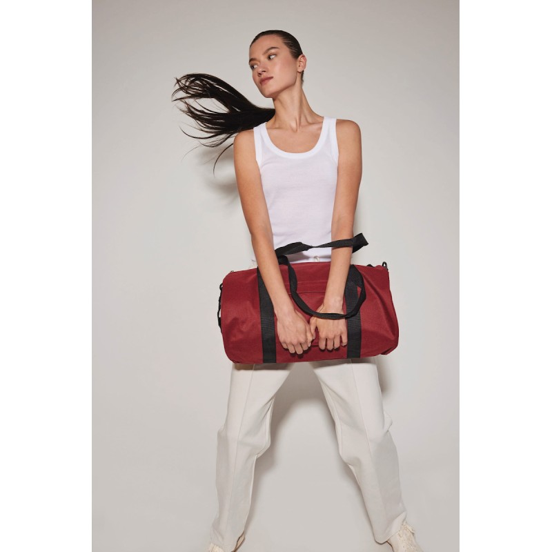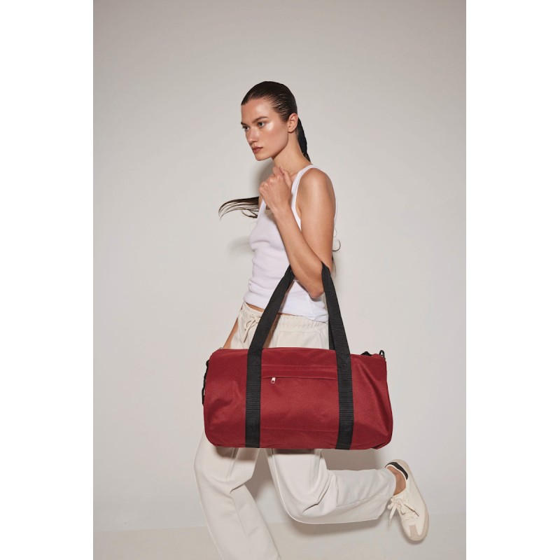 100% polyester 600DPVC RPET. Sac polochon conçu à partir de 50% de polyester recyclé. Poche avant avec fermeture zippée. Bandoulière réglable.