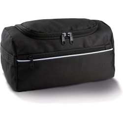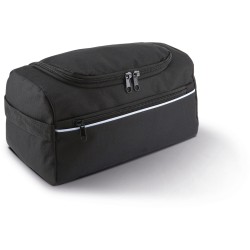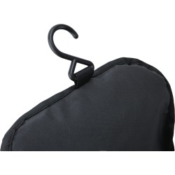 Trousse de toilette en polyester 600D, rabat sur le dessus équipé d'un crochet de suspension, poche intérieure, grande poche devant, poignée côté.