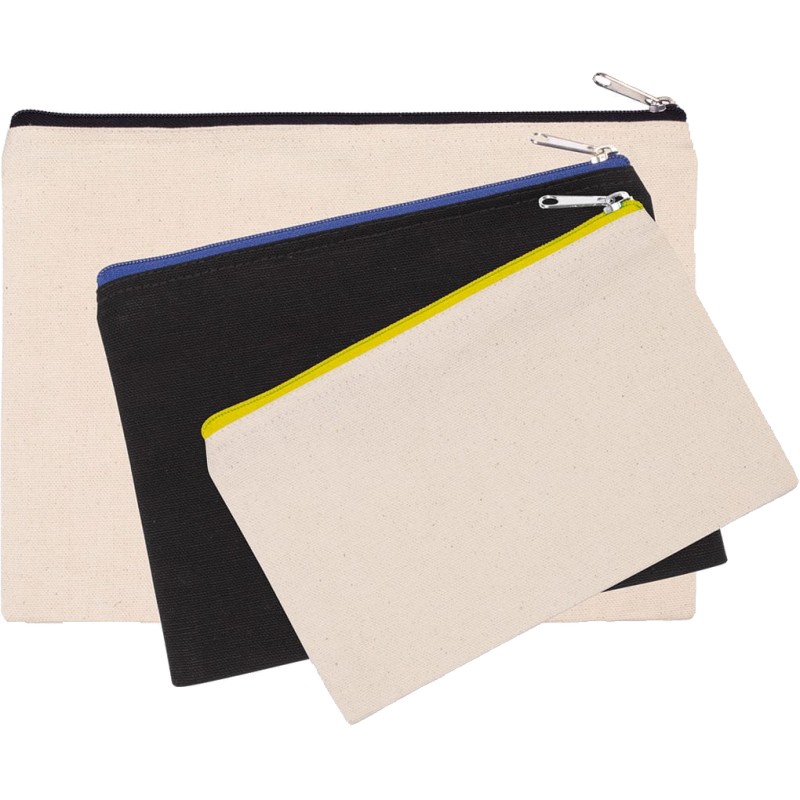 Pochette en coton canvas, fermeture zippée de couleur contrastée. Modèle moyen.