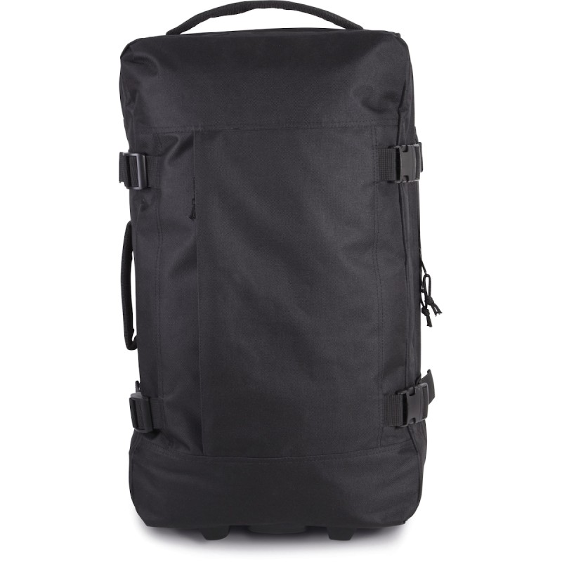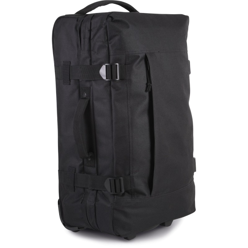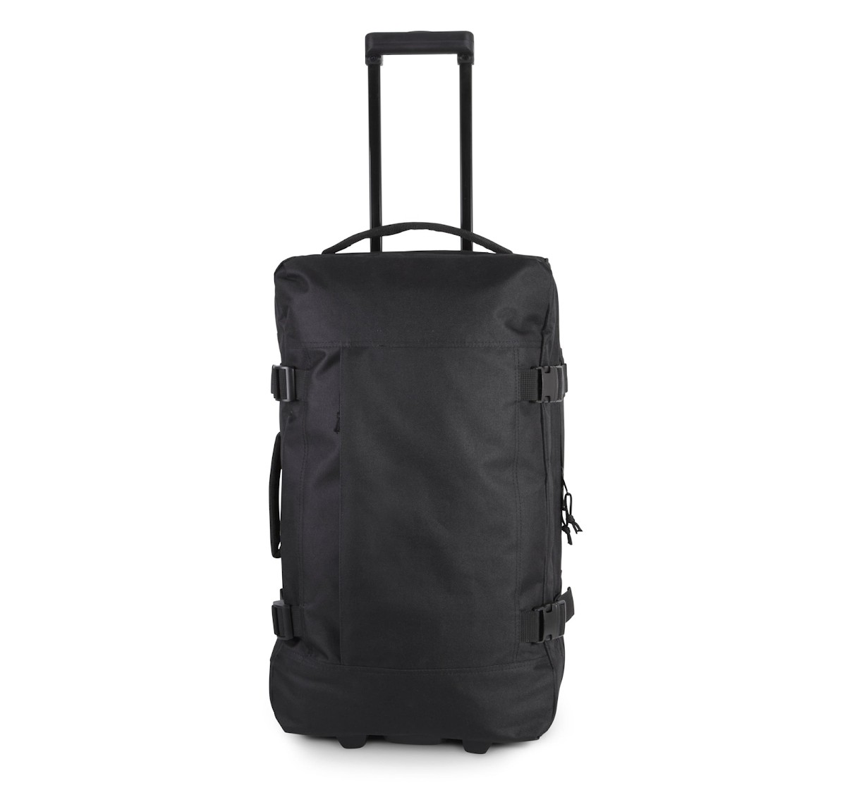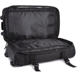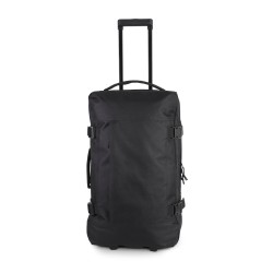 Sac trolley en polyester 600D avec grande poche zippée à l'avant pour faciliter la personnalisation. 2 compartiments internes avec sangles de maintien. Sangles extérieures pour ajuster le volume. Base avec renforcement en relief et points d'arrêt sur les poignées.