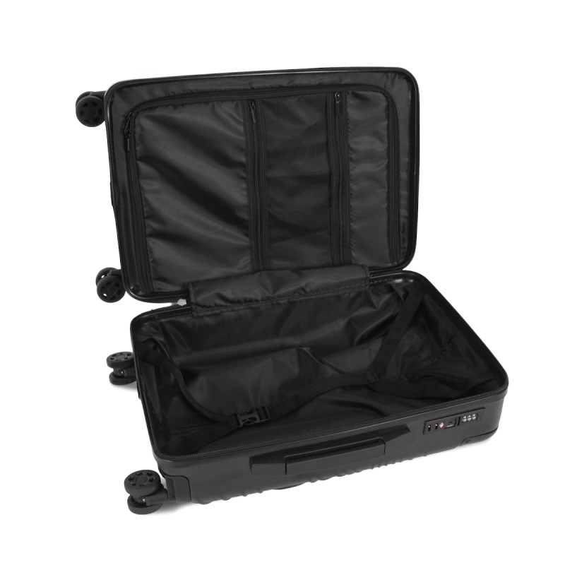 100% polycarbonate. Trolley taille cabine. Imaginé avec un design original représentant les reliefs du Pic de l'Aneto dans les Pyrénées, ce trolley en aluminium est doté de 4 roues multidirectionnelles et de pieds de protection latéraux pour poser la valise sur le côté. Les angles sont réalisés en matériaux en caoutchouc pour une meilleure protection. Pour plus de confort il comporte : une poignée supérieure extensible et une poignée sur le côté, une sangle rétractable sur le devant pour accrocher et transporter une sacoche porte document, deux compartiments internes dont un avec une sangle de maintien et un autre avec une fermeture glissière et poches pour accessoires. Pour votre sécurité, ce trolley est équipé d'une fermeture par TSA par combinaison.