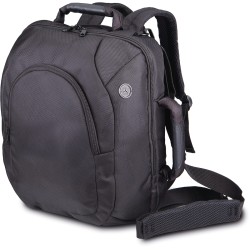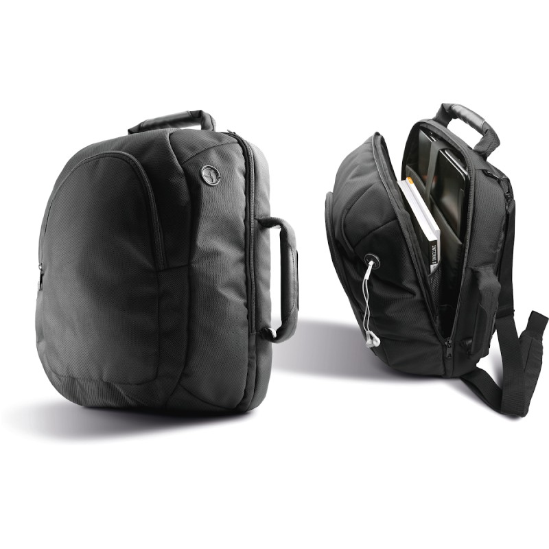 Sac ordinateur portable / porte-documents à double usage pouvant se transformer en sac à dos. Polyester recyclé 1680D, Bretelles cachées, empiècement dos matelassé, attache fixation trolley au dos, bandoulière ajustable et amovible avec confort d'épaule, poignées renforcées et matelassées, poche frontale multifonctions, compartiment central entièrement matelassé pour ordinateur jusqu'à 15" et documents, ouverture pour écouteurs, porte-clefs.