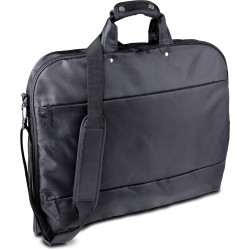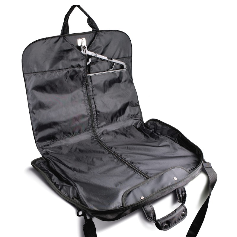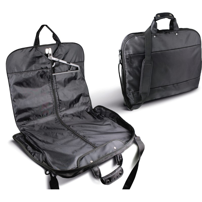 Housse de voyage en polyester 840D. 2 grandes poches devant zippées pour faciliter la sérigraphie / broderie et une petite pour les accessoires. Bandoulière ajustable et amovible avec crochet de suspension et cintre inclus, doublure de protection pour les vêtements et 2 larges poches intérieures.