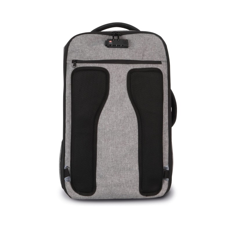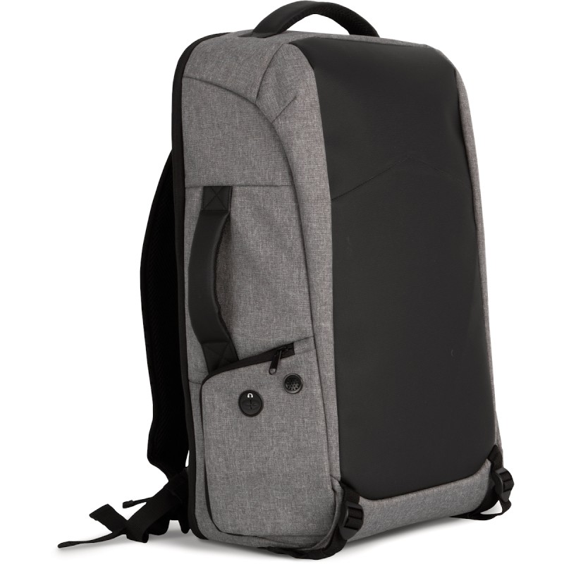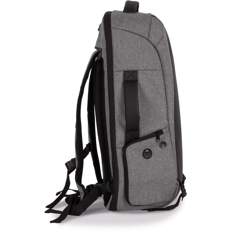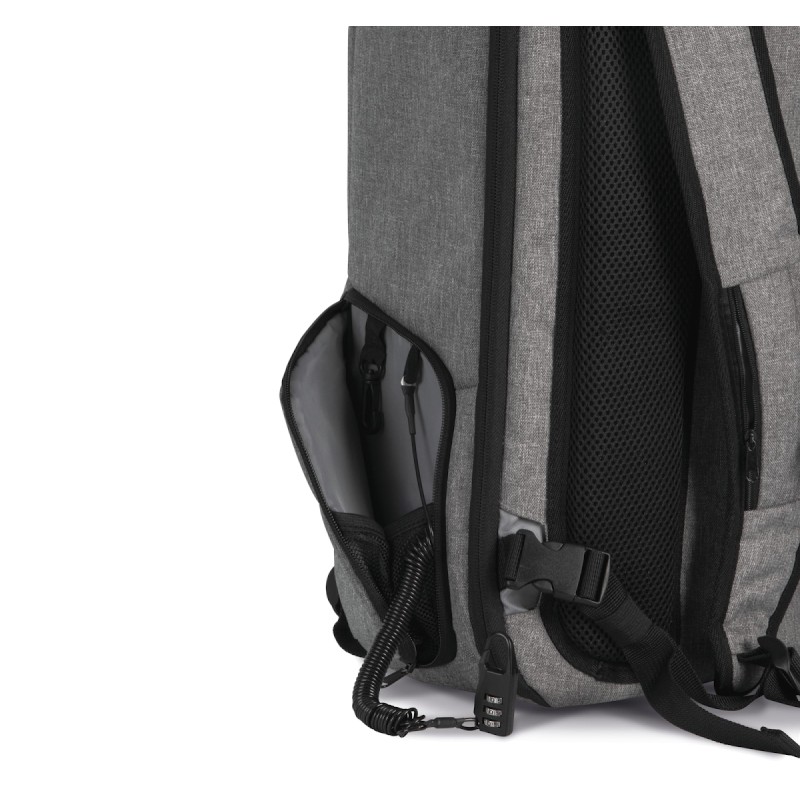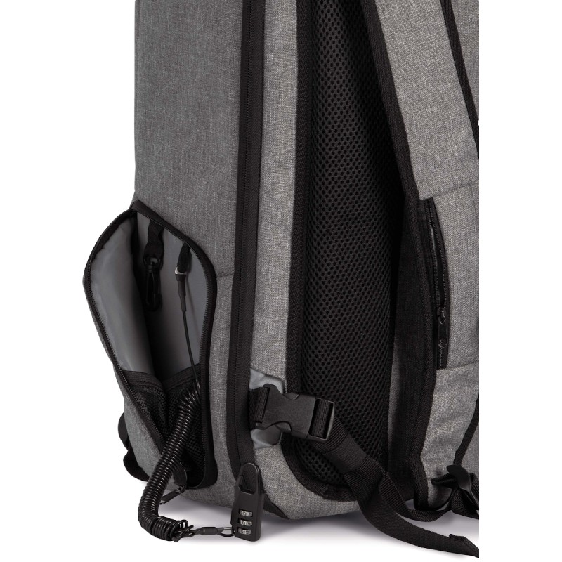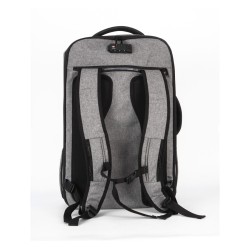 100% polyester. Dont 50% de polyester recyclé. Compagnon de voyage. Ses particularités : fermeture à glissière antivol avec système TSA par combinaison ; poche latérale avec câble antivol ; poche interne avec une protection RFID ; renforts matelassés dorsaux ; bretelles ajustables matelassées ; sangle de poitrine réglable ; 2 sangles d'attache sous le sac ; 2 poches sur le côté ; 1 poche de chargement sur le côté avec port USB et micro USB ; 2 poches zippées sur les bretelles ; 1 bandoulière matelassée amovible ; 1 compartiment intérieur pour ordinateur et tablette ; 1 poche filet et 2 pochettes zippées amovibles pour câbles et accessoires.