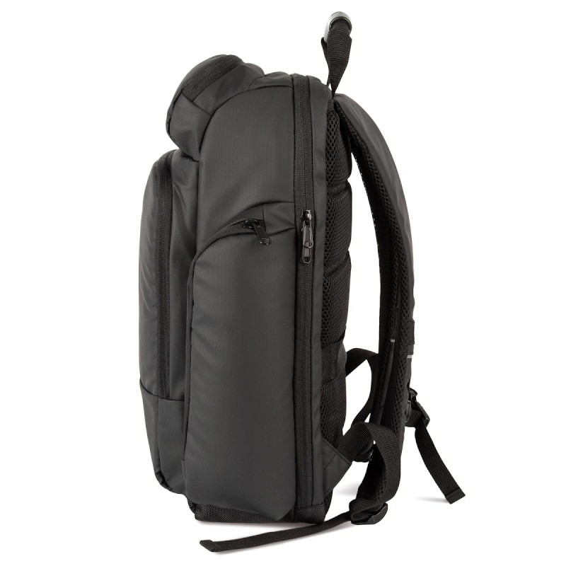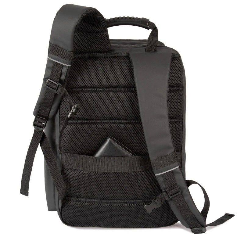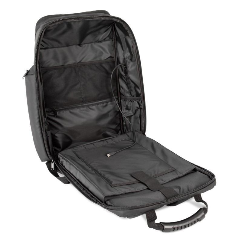 100% polyester. Sac à dos de travail avec compartiment pour ordinateur (jusqu'à 15 pouces) et compartiment rembourré pour tablette offrant un large espace de rangement pour les documents. Le compartiment principal comprend deux poches en filet, une grande poche zippée et deux poches latérales pour la banque d'alimentation. Connecteur externe de type C avec câble interne pour la banque d'énergie. Poche latérale extérieure avec doublure en aluminium pour ranger des bouteilles fraîches (jusqu'à 50 cl). Grande poche/compartiment avant avec intérieur organisé et poche extérieure zippée. Fond en 1680D de couleur contrastée offrant une résistance maximale et une protection contre l'abrasion. Grande poche supérieure matelassée pour le rangement ou pour les lunettes de soleil. Dos et bretelles rembourrés et respirants. Ruban adhésif au dos permettant de glisser le sac à dos dans les poignées de trolley et de le rendre facile à porter.