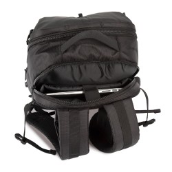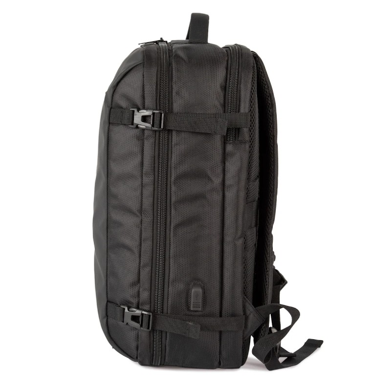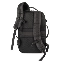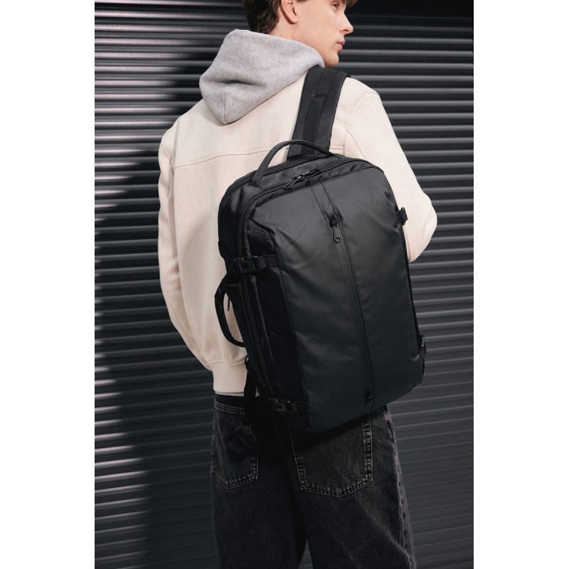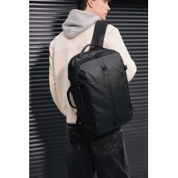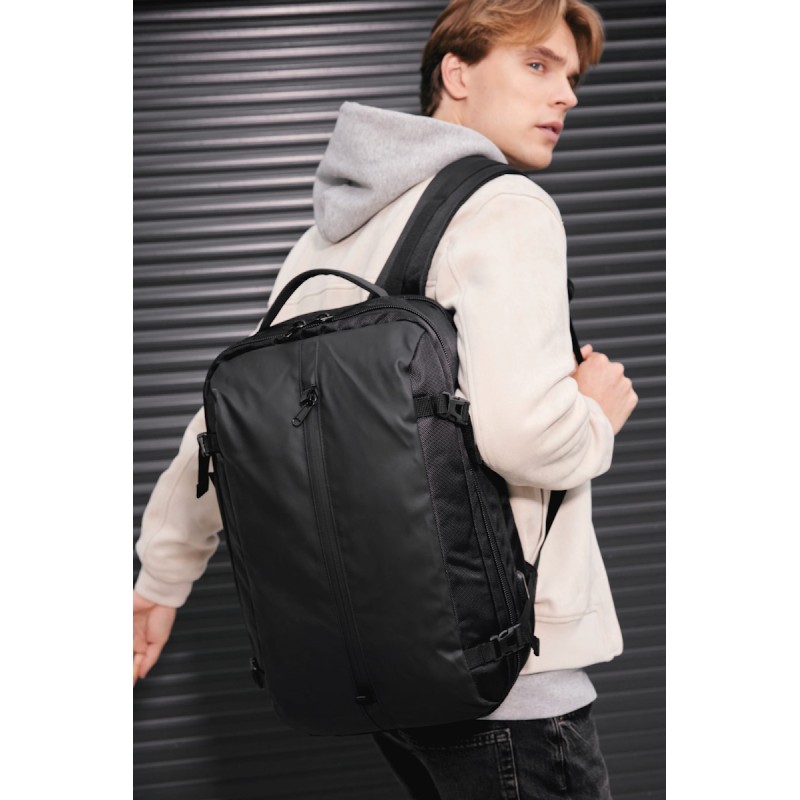 100% polyester. Sac à dos de travail en polyester avec matériaux contrastés. Grande poche frontale zippée. Grand compartiment principal dédiés aux documents avec deux poches en filet. Compartiment arrière rembourré pour ordinateur (jusqu'à 15 pouces) et tablette. Poche latérale pour bouteille. Connecteur externe de type C avec câble interne pour banque d'alimentation. Bande adhésive au dos permettant de glisser le sac à dos dans la poignée d'une valise et de le transporter confortablement. Dos et bretelles rembourrés et respirants.