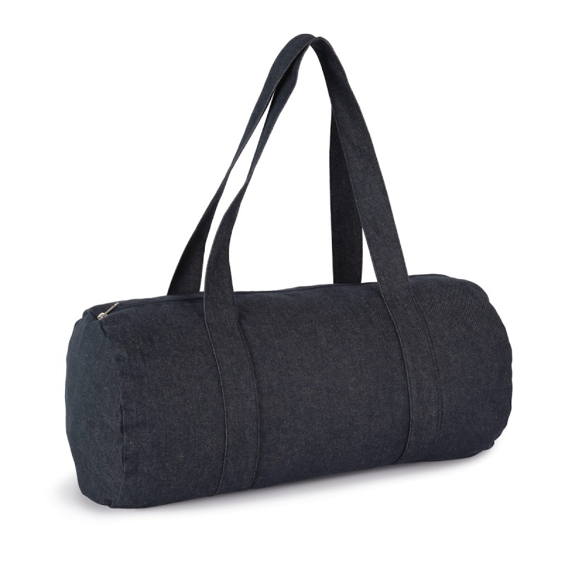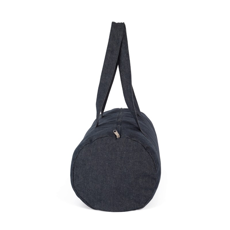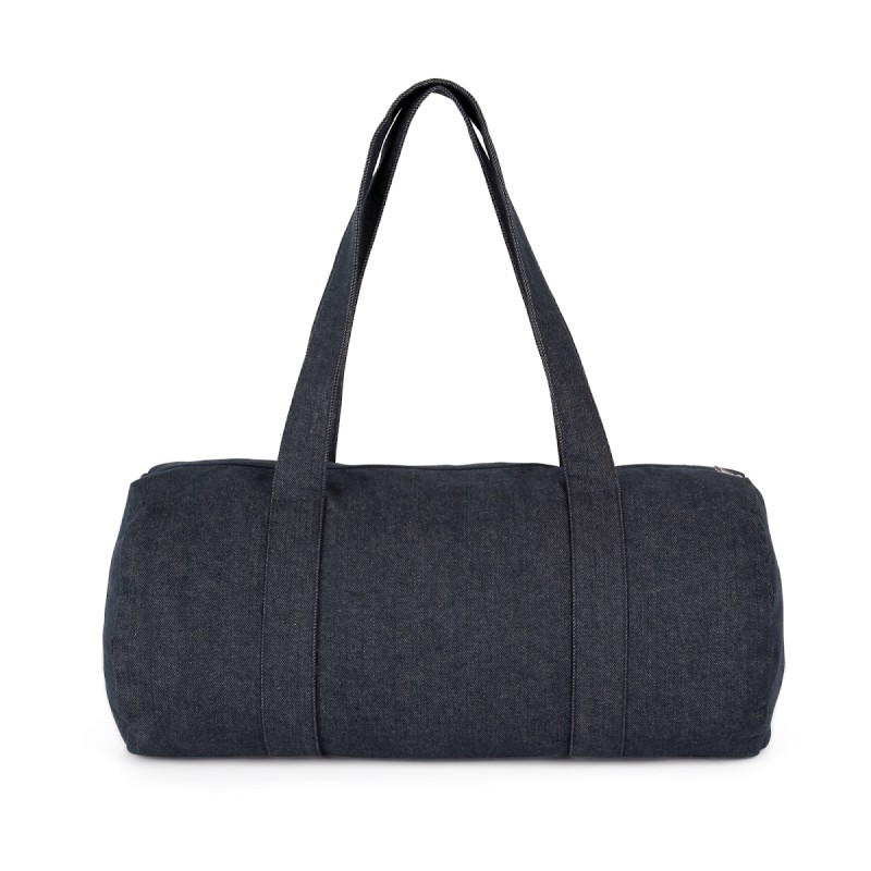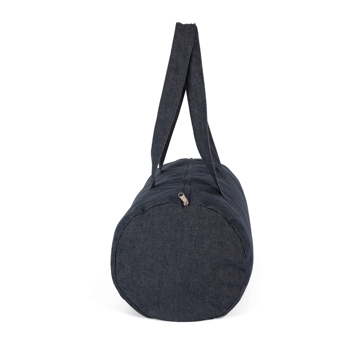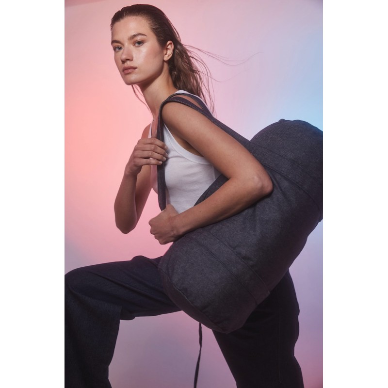 70% coton recyclé / 28% polyester recyclé / 2% autres fibres. Sac polochon avec poignées le long du corps du sac, réalisées dans la même matière. Étant recyclée, cette matière ne perd pas sa couleur.