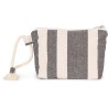 67% coton recyclé / 30% polyester recyclé / 3% autres fibres. La pochette est doublée par un tissu contrasté et possède une fermeture zippée. La pochette est dotée d'une sangle en corde de coton. Le motif rayé est inspiré des skylines des grandes villes métropolitaines. Le tissage jacquard confère un aspect unique à chaque pièce.