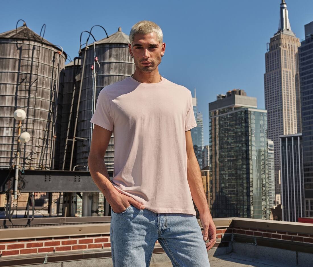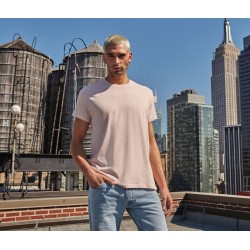 Tee-shirt homme col rond 150 organique ou organique en conversion. Coupe tubulaire. Col en bords côte 1x1. Sans étiquette de marque.