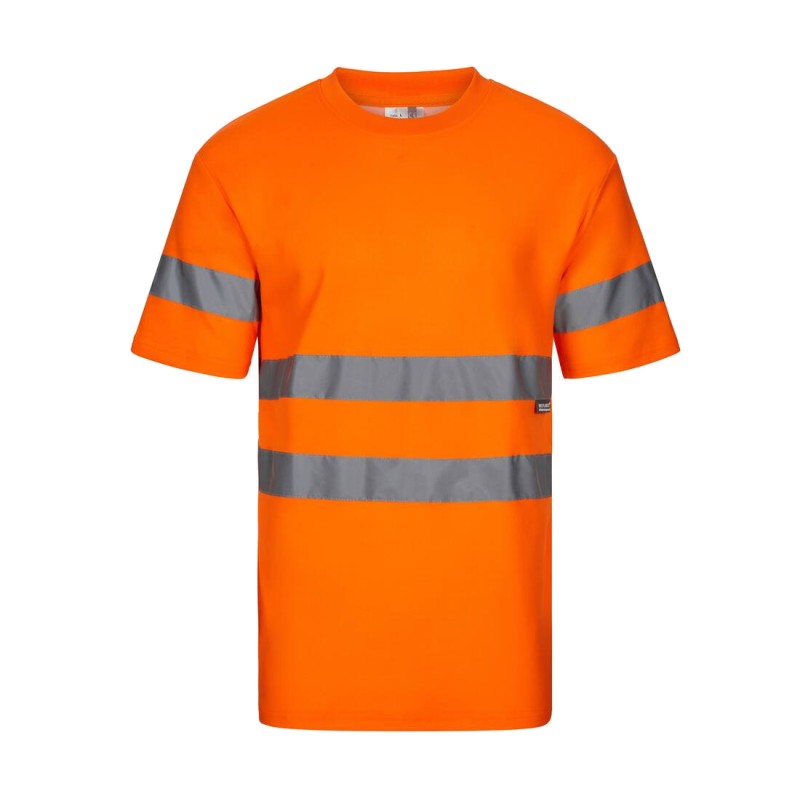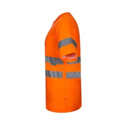 Maille piquée. 2 bandes réfléchissantes horizontales aux manches et sur le corps. Double coutures. Conforme à la certification EN20471 Classe 2.
