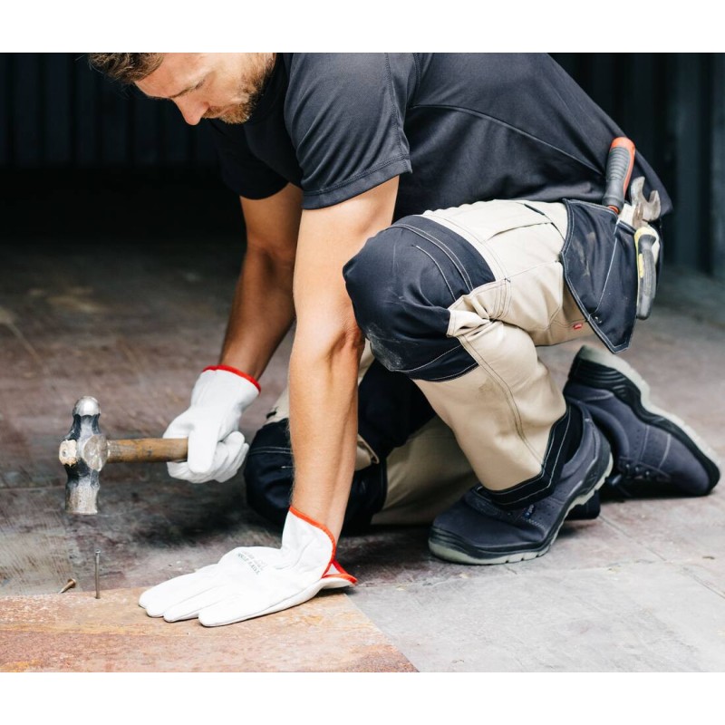 Fermeture à bouton avec braguette zippée. Ceinture élastiquée. Renfort en tissu oxford sur les genoux et le bas du pantalon. Renfort en tissu à l'arrière. Poches pour genouillère, avec fermeture Velcro®. Double couture de sécurité. Pinces aux genoux. Anneau en plastique sur l’un des passants de la ceinture. Passants pour ceinture. Poches flottantes avec différents compartiments. 10 poches.