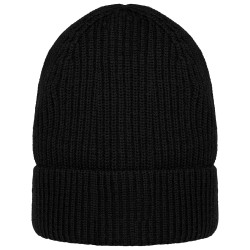 100% laine mérinos responsable RWS (Responsible Wool Standard). Fil peigné. Jauge 7. Tricotage en côte 1 x 1. Bonnet à large revers. Poids moyen : 80 g.