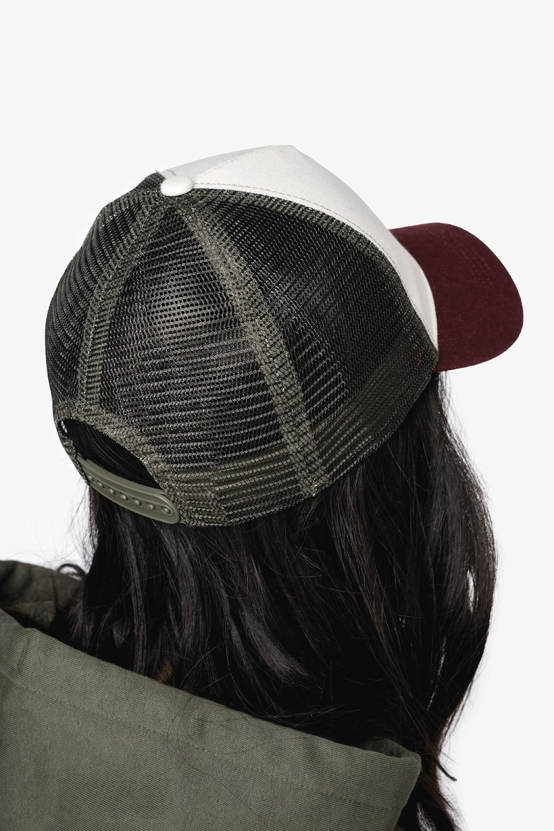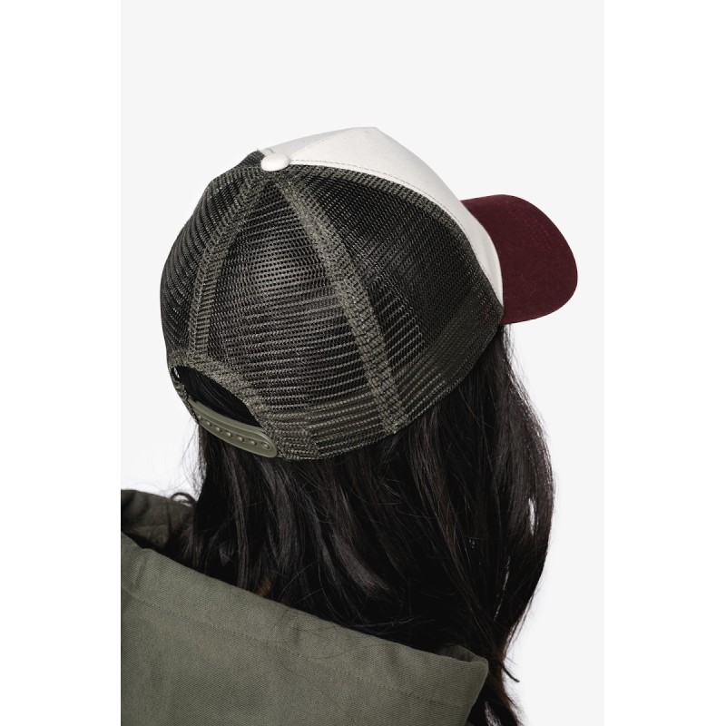Visière et panneau avant en 100% coton biologique. Panneaux arrières en mesh 100% polyester recyclé post consumer. Tissus en twill et en mesh. Casquette 5 panneaux ajustable avec patte de serrage en plastique recyclé à l'arrière. Visière avec surpiqûres. Panneau avant avec renfort. Biais finition intérieure.