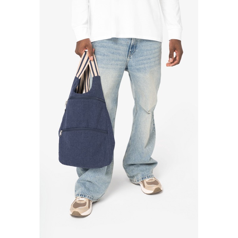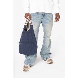 75% coton recyclé pré-consumer / 22% polyester recyclé post-consumer / 3% autres fibres. ONE SIZE (28 x 10 x 47cm). Capacité : 13L. Anses contrastées de 73cm de long et 4,25cm de large.