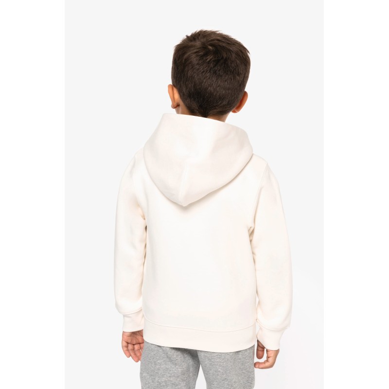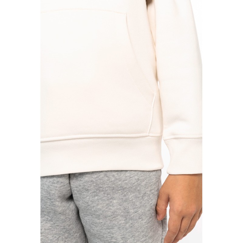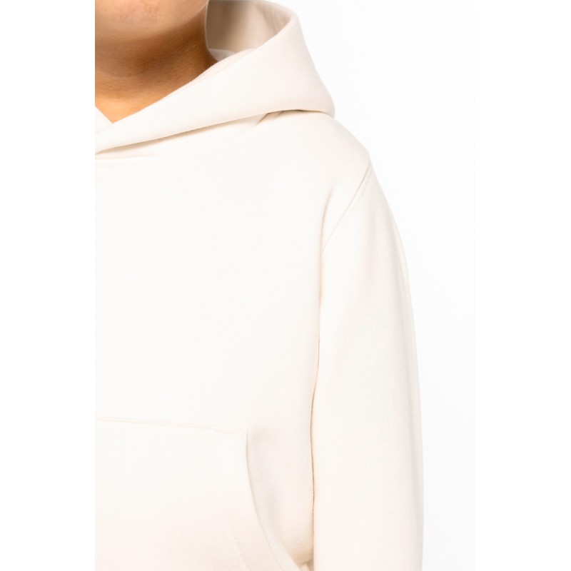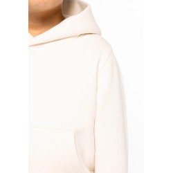 85% coton biologique / 15% polyester recyclé post-consumer. Coton peigné ringspun. Coupe ajustée. Molleton gratté 3 fils LSF (Low Shrinkage Fleece : molleton pré-rétréci). Lavé aux enzymes. 1/2 lune au dos. Bord cote 1 x 1 bas de vêtement et bas de manches. Double surpiqûre sur bas de manches, emmanchures et bas de vêtement. Simple surpiqûre à l’encolure. Encolure avec bande de propreté intérieure en chevrons. Capuche doublée en matière principale très épurée sans surpiqûre à l’ouverture.