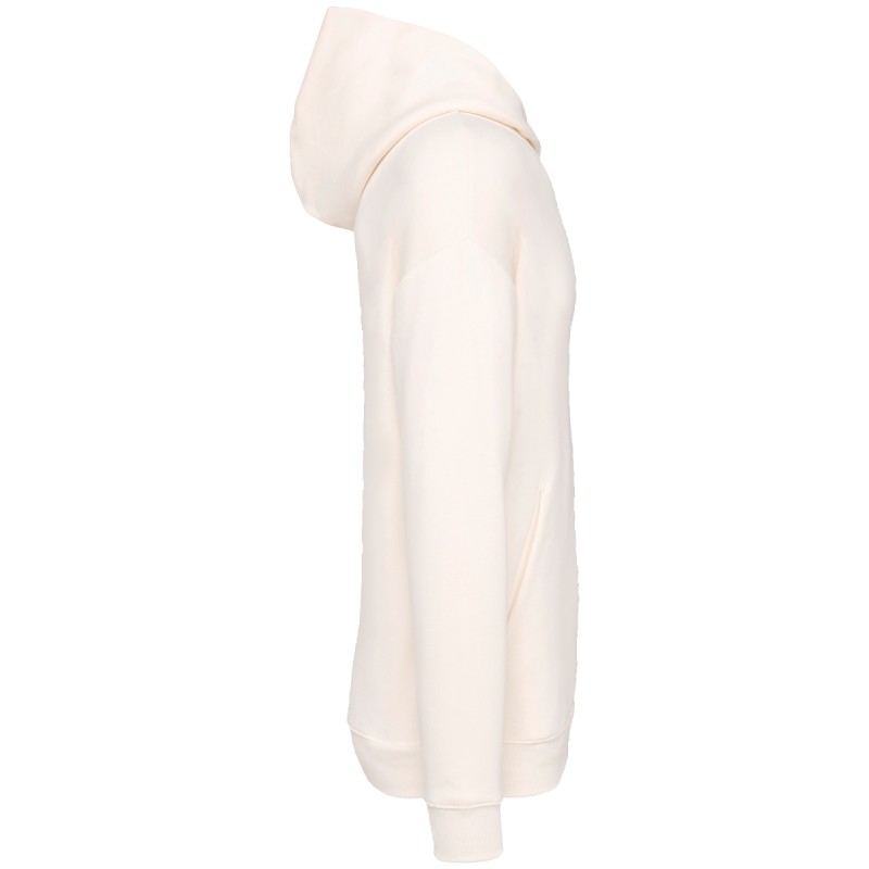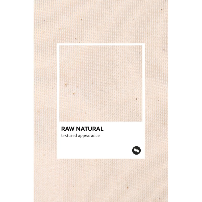 85% coton biologique / 15% polyester recyclé post consumer. Coton peigné ringspun. Coupe oversize à épaules tombantes. Lavé aux enzymes. Molleton gratté 3 fils LSF (Low Shrinkage Fleece : molleton pré-rétréci). 1/2 lune au dos. Capuche doublée en matière principale. Poches côtés minimalistes. Bord côte 2 x 1 bas de vêtement et bas de manches. Double surpiqûre à cheval sur le bas de vêtement et le bas de manches. Encolure avec bande de propreté intérieure en chevrons. La couleur Raw Natural se distingue par son aspect brut visuellement texturé, parsemée de fines particules visibles à l’œil nu.