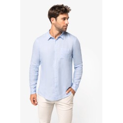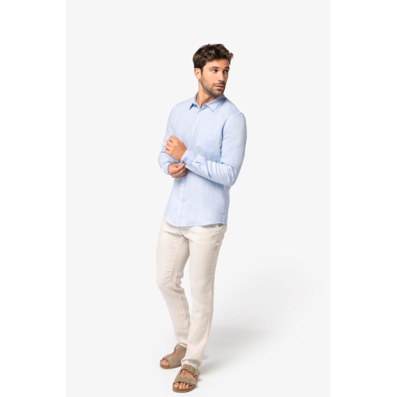 100% lin. Tissé. Coupe ajustée. Patte de boutonnage classique avec boutons effet nacré. Poche poitrine côté coeur. Empiècement dos avec plis d'aisance. Poignet boutonné avec patte capucin. Galon contrasté. Intérieur pied de col Natural. La couleur Linen n'a pas subi de teinture, et peut varier d'un produit à l'autre.