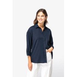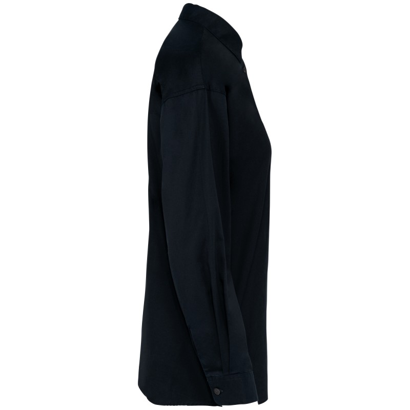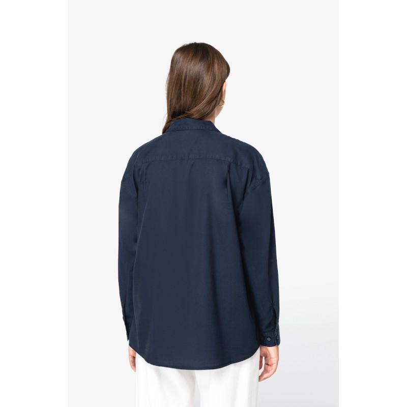 60% Lyocell TENCEL™* / 40% coton biologique. Coupe loose légèrement évasée. Lavé aux enzymes. Boutons en plastique recyclé ton sur ton. Manches longues deux plis. Empiècement au dos. Deux plis d’aisance au dos. Poignets boutonnés avec fentes. Vêtement lavé après montage : les couleurs peuvent légèrement varier. Ce produit est susceptible de déteindre au contact avec des surfaces ou vêtements clairs. * TENCEL™ est une marque de Lenzing AG.