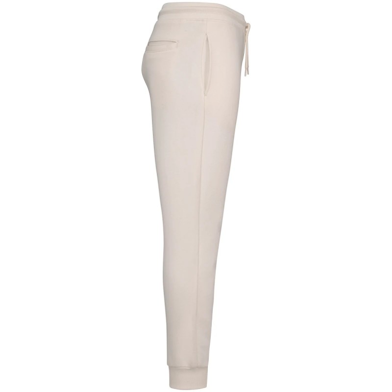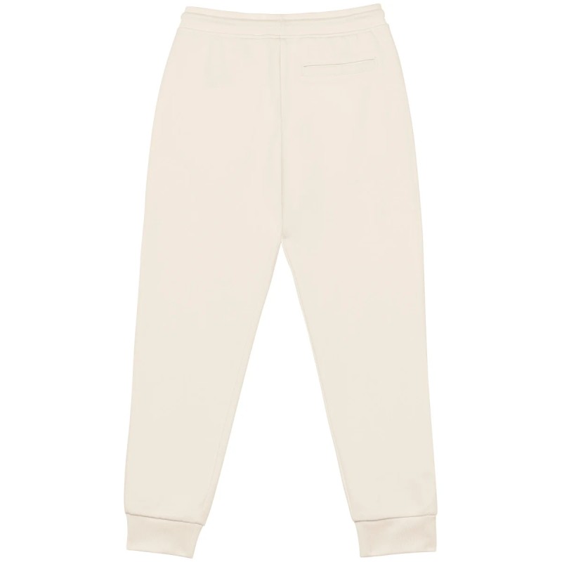85% coton biologique / 15% polyester recyclé post-consumer. Coton peigné. Molleton gratté 3 fils LSF (Low Shrinkage Fleece : molleton pré-rétréci). Lavé aux enzymes. Ceinture élastiquée en bord cote 1 x 1 avec cordon de serrage rond en coton biologique. Oeillet boutonnière pour cordon ceinture. Poches latérales et une poche arrière passepoilée. Bord côte 1 x 1 bas de jambes.
