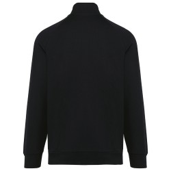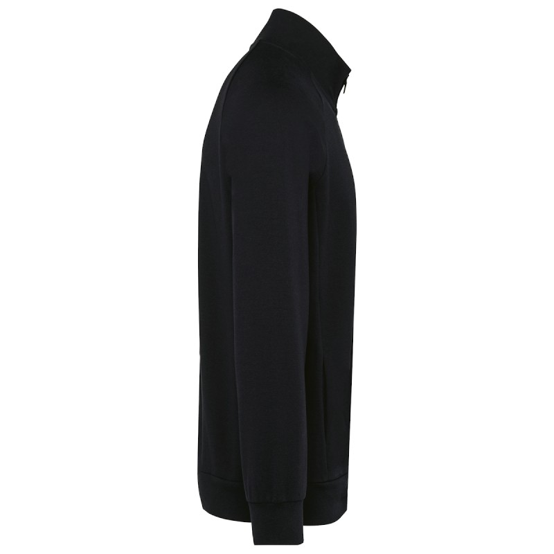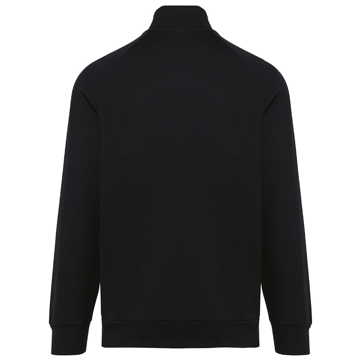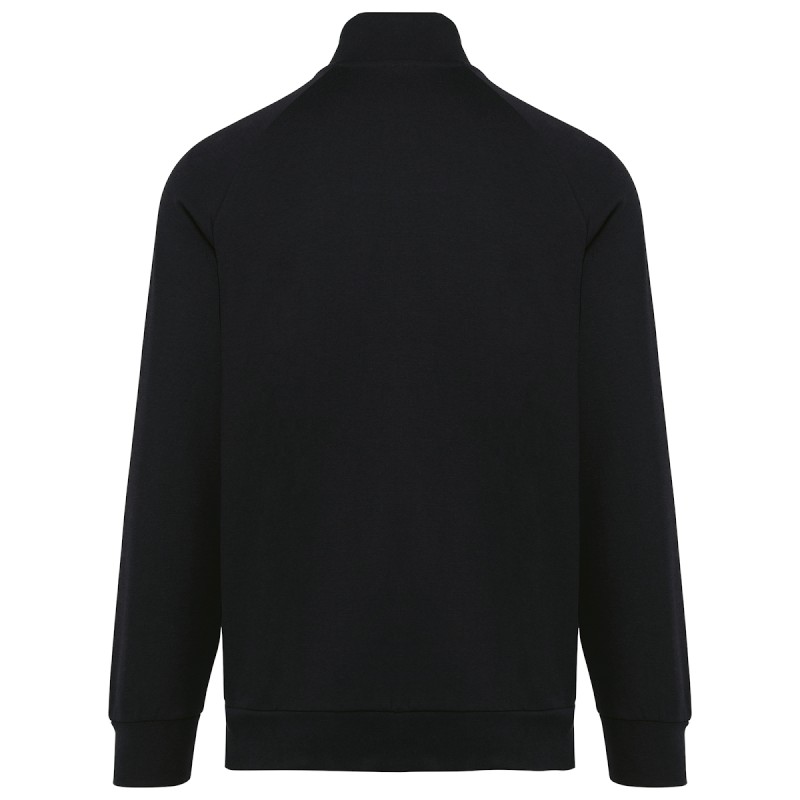 70% coton / 26% polyester / 4% élasthanne. Coton peigné. Tissu interlock. Traitement LSI (Low Shrinkage Interlock). Surpiqûres au col. Bande de propreté sur l'encolure intérieure. Zip nylon ton sur ton avec zipper métal et finition bande de propreté à l'intérieur. Manches raglan. Rib 1x1. 2 poches prisent dans la couture de l'empiècement. Pas d'étiquette de marque, uniquement une puce de taille pour faciliter la personnalisation.