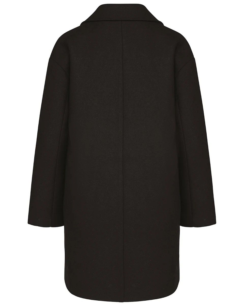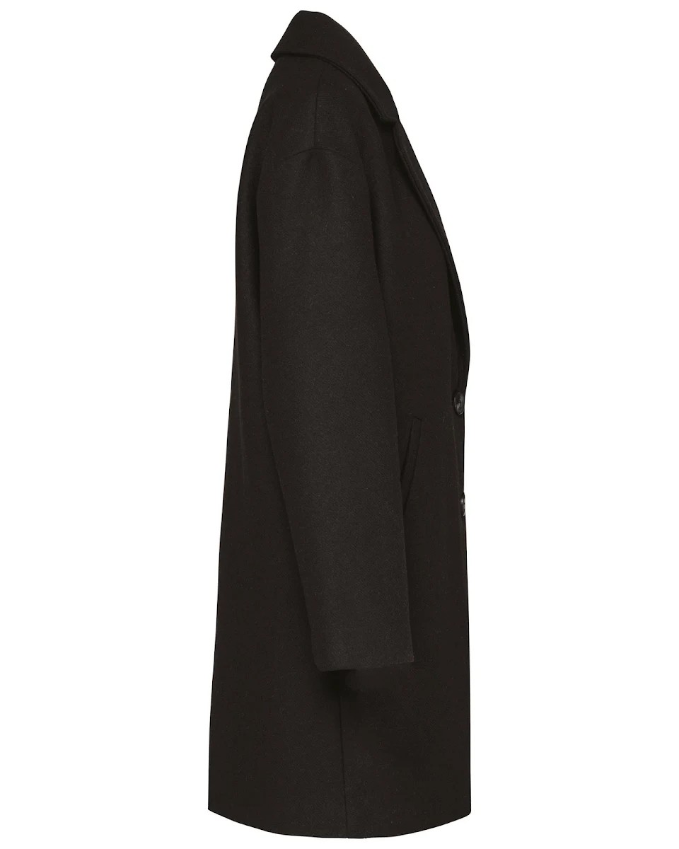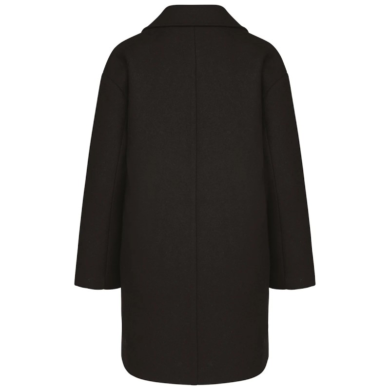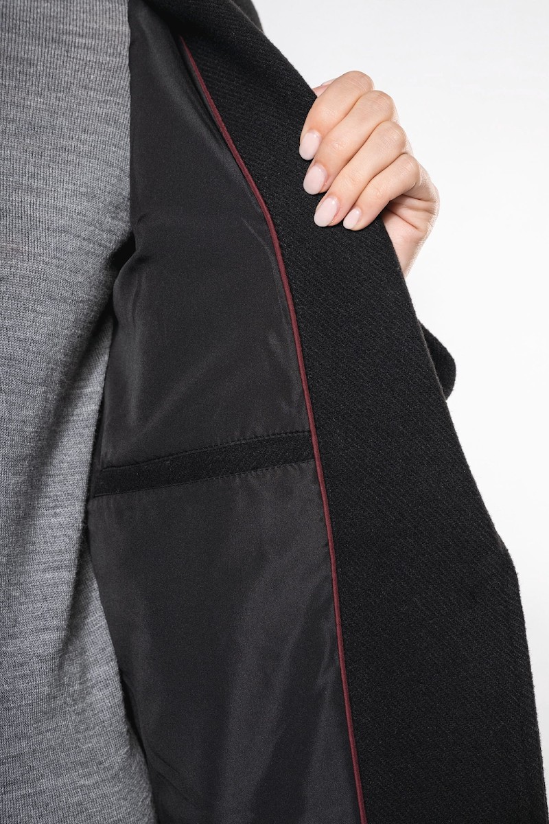 80% polyester et 20% laine. Drap de laine avec construction twill. Coupe loose épaules tombantes. Col tailleur avec pied de col et 2 boutons effet corne milieu devant. Deux poches passepoilées biaisées. Poche intérieure passepoilée côté cœur, biais de finition contrasté.