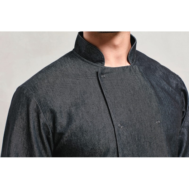 Veste de cuisine à manches longues unisexe avec fermeture croisée sur le devant. Dix boutons pression pour une veste simple et facile à porter. Col Mao avec surpiqûres.