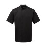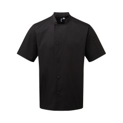Veste de cuisine à manches courtes en tissu résistant qui se ferme sur le côté droit à cinq boutons en résine durable. Double poche à stylo très utile sur la manche gauche. Cette veste à col Mao est disponible en noir et blanc et constitue un excellent rapport qualité-prix.