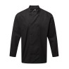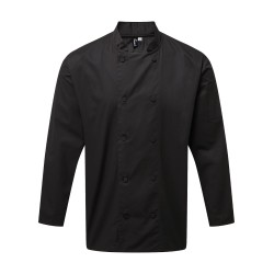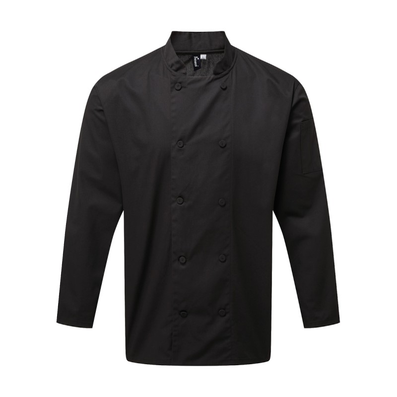 Veste de cuisine à manches longues en notre tissu exclusif Coolchecker®. L’empiècement dans le dos est fabriqué du tissu Coolchecker® qui aide le cuisinier à rester au frais pendant la durée du service avec ses propriétés exceptionnelles d'évaporation rapide de l'humidité. Fermeture cache-cœur à 10 boutons dans la continuité du tissu, col Mao et double poche à stylo utile sur la manche gauche.