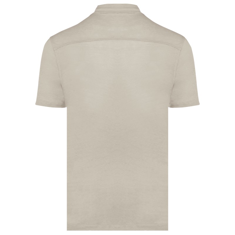 100% lin. Maille. Coupe ajustée. Col avec pied de col. Empiècement dos. Ourlet simple surpiqûre bas de manches et de vêtement. Patte de boutonnage avec boutons contrastés effet nacré en plastique recyclé sur toutes les couleurs.