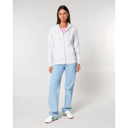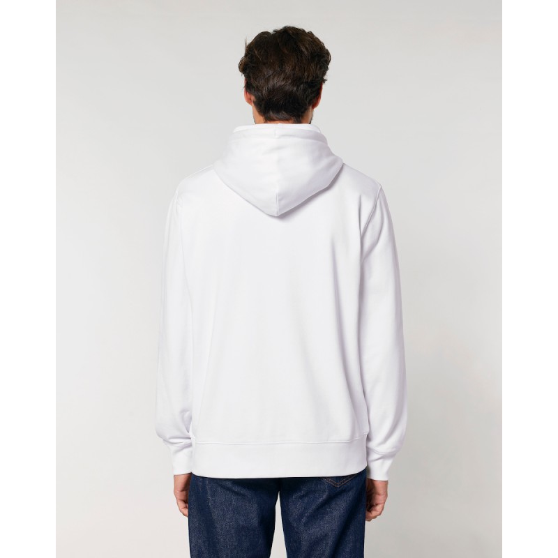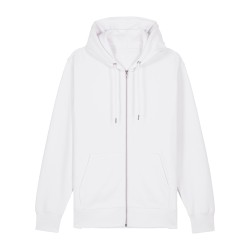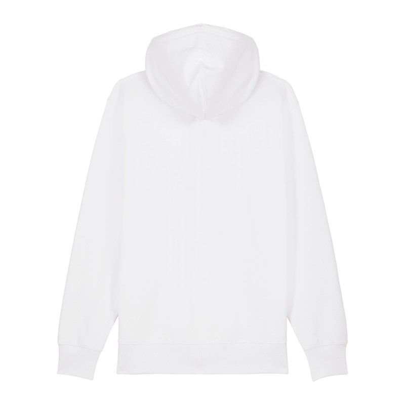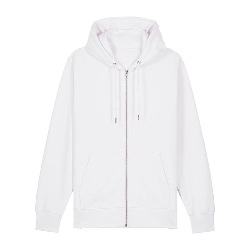 Manches montées Capuche double doublée dans la matière principale Cordons ronds dans la matière principale Embouts métalliques fermés et oeillets métalliques Ruban à chevrons à la couture intérieure du col arrière Demi-lune dans la matière principale à l'arrière du cou Surpiqûre à 2 aiguilles centrée sur la couture à l'ourlet, au poignet et à l'emmanchure Côtes 1x1 à l'ourlet des manches et du bas Poche kangourou sur le devant Fermeture éclair en métal apparente au milieu devant