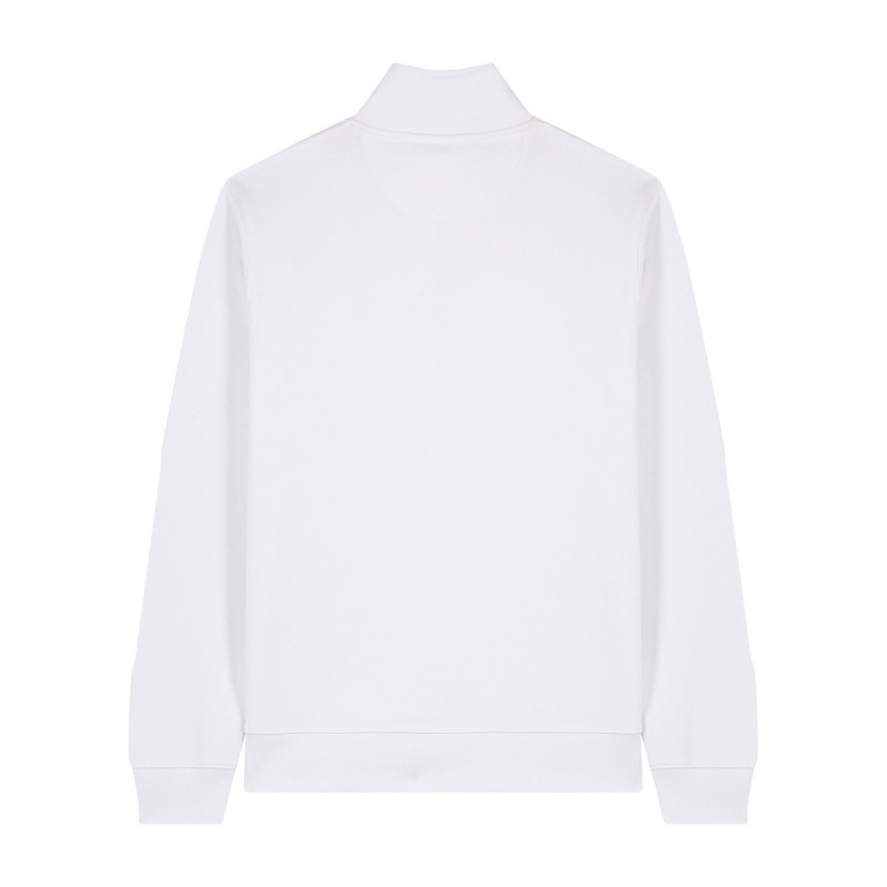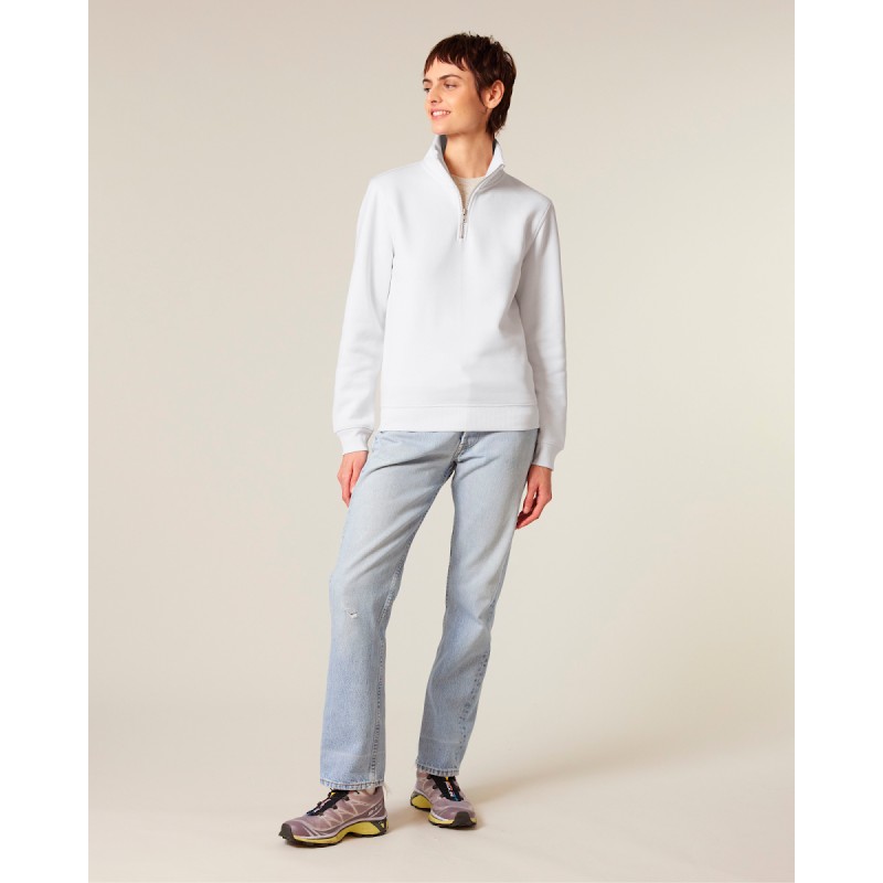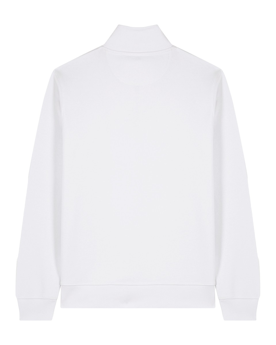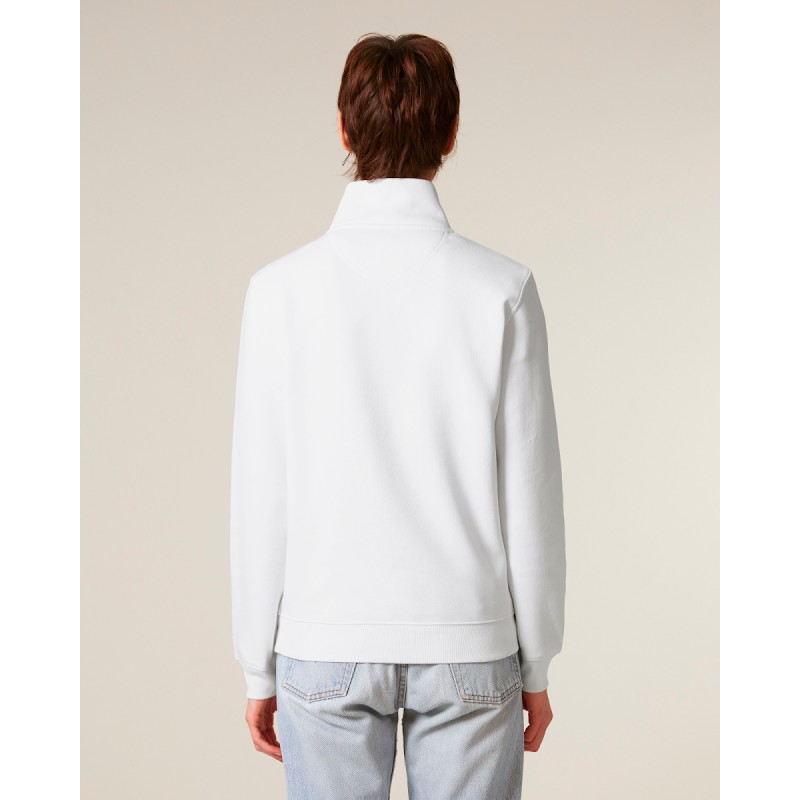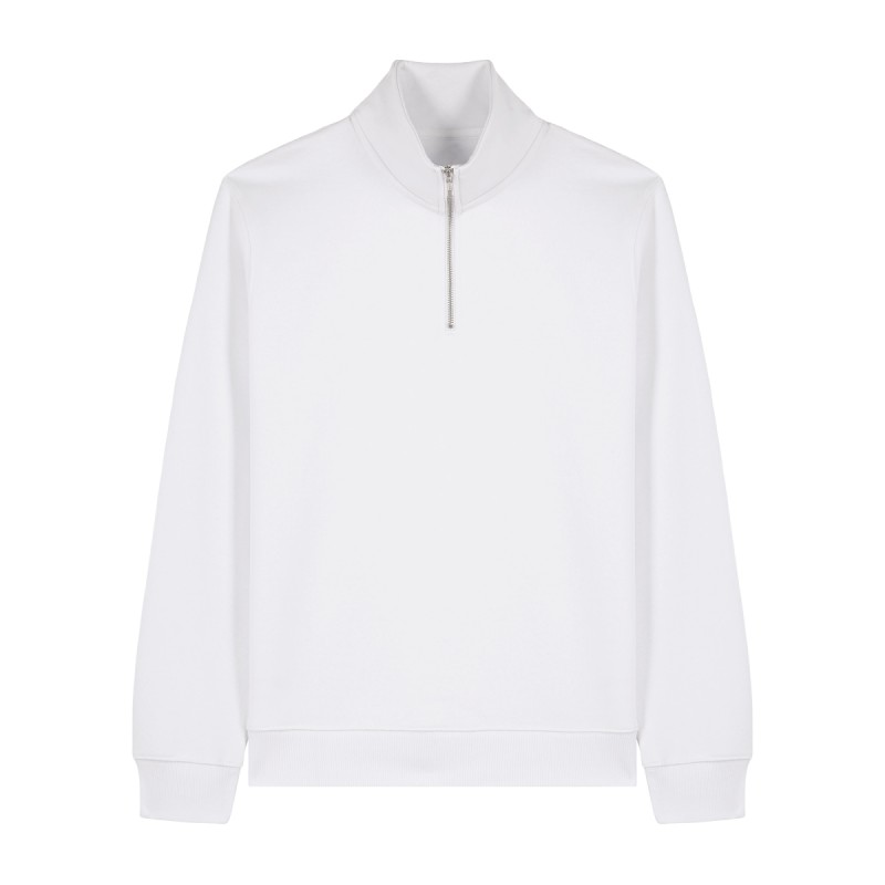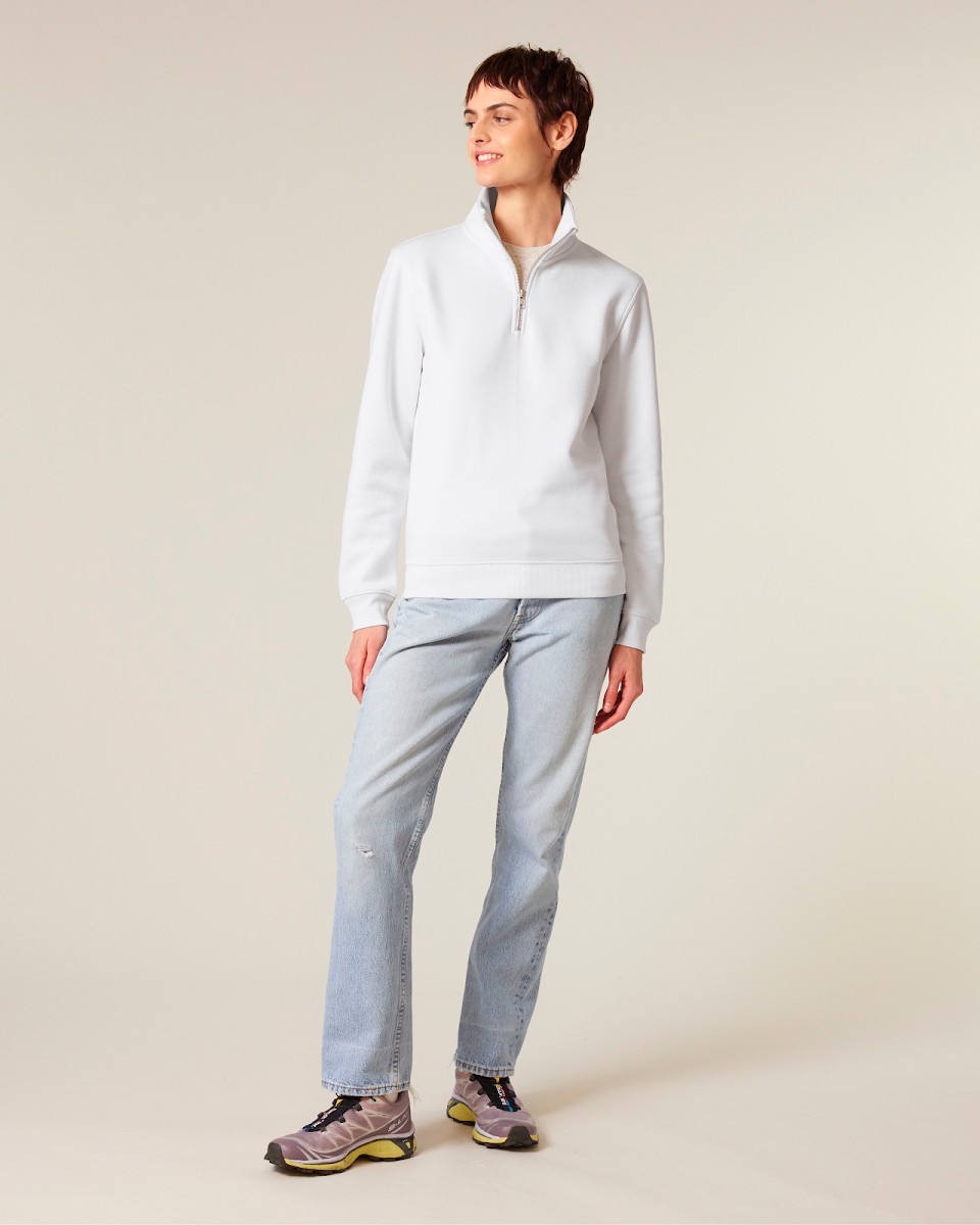 Manches montées Col cheminée en tissu de la même matière Fermeture éclair d'un quart au milieu devant Côtes 1x1 aux poignets des manches et à l'ourlet du bas Surpiqûres doubles à l'emmanchure, aux poignets des manches et à l'ourlet du bas Bande de renfort en chevron à l'intérieur du col et à l'intérieur de la fermeture éclair Demi-lune en tissu de la même matière au dos du cou