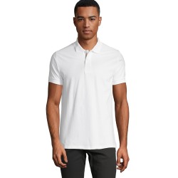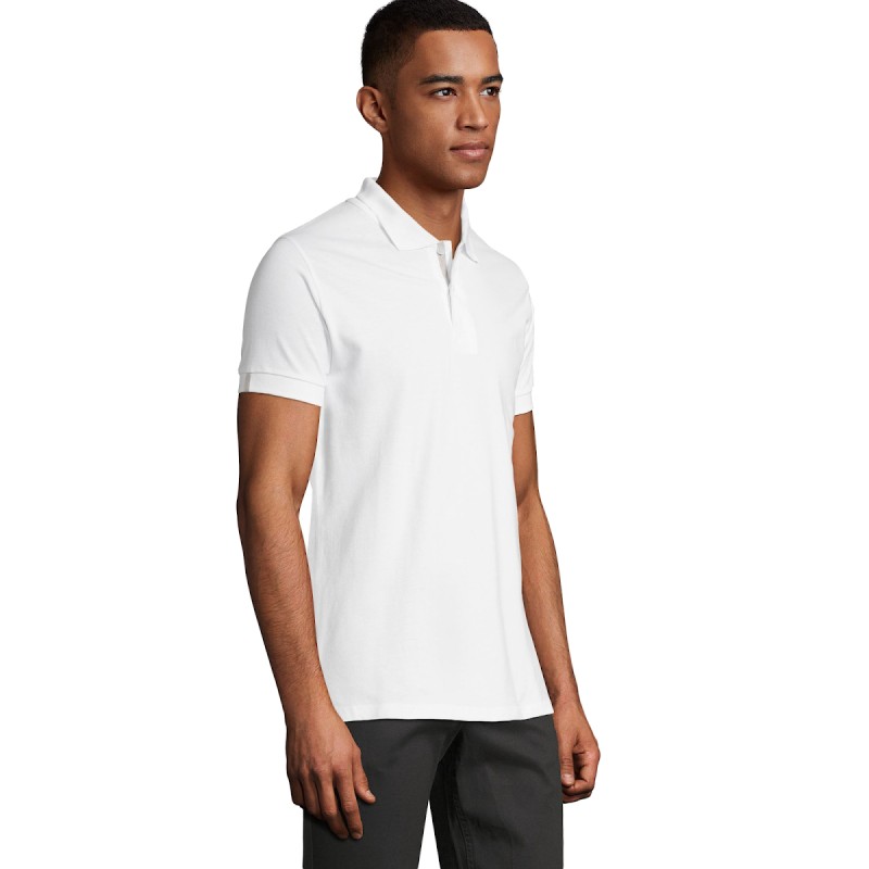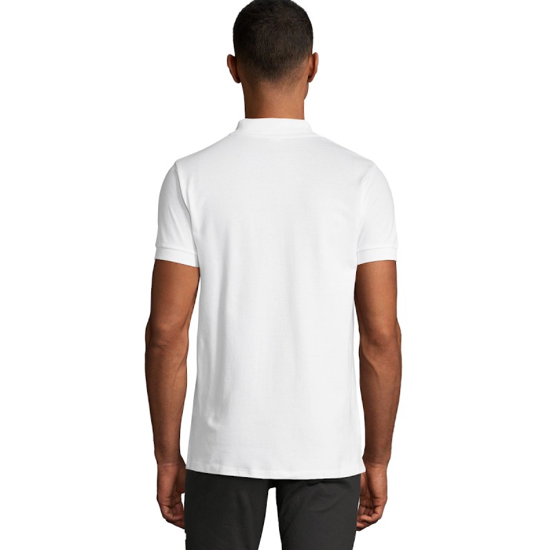 Col et bas de manches en bord côte Bande de propreté contrastée au col Manches courtes Patte de boutonnage 2 boutons blancs nacrés Bande en sergé grise contrastée à l'encolure, sur la patte de boutonnage, aux fentes latérales + tag en bas de manche Coupé cousu Coupe ajustée Bouton de rechange sur couture intérieure côté