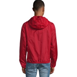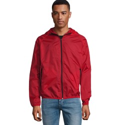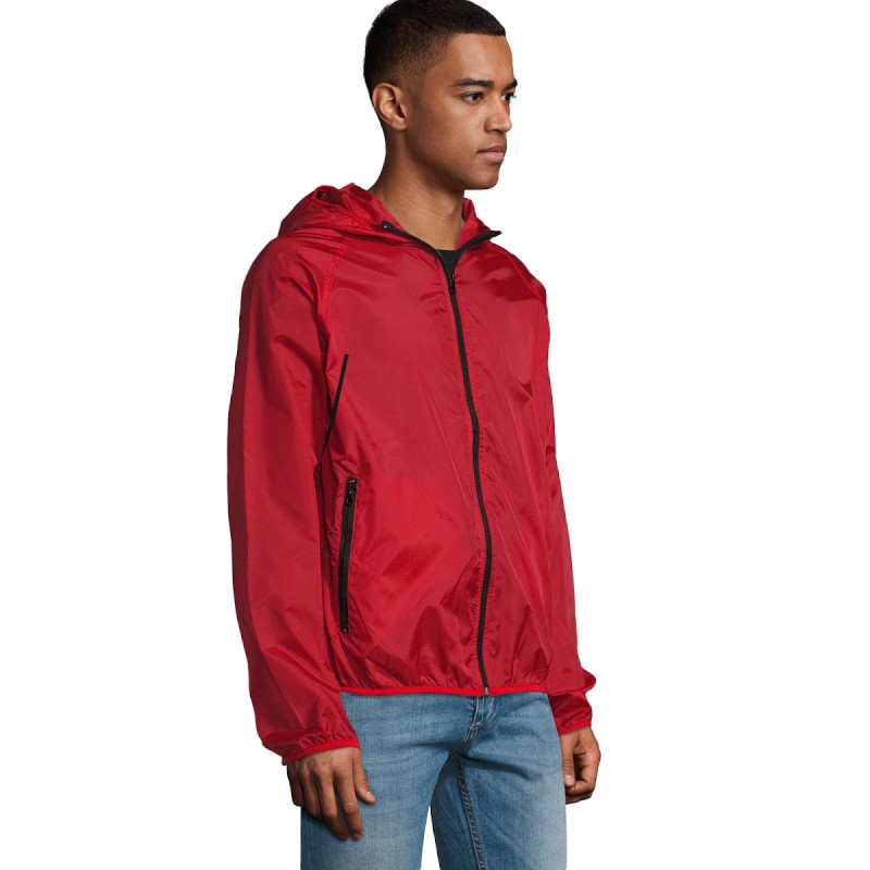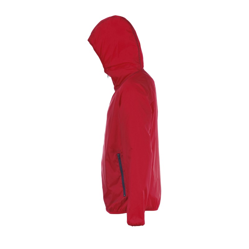 Ouverture par zip contrasté Poignets, capuche et bas élastiqués Poches côtés avec zip contrasté Manches raglan Système de pliage dans sa poche