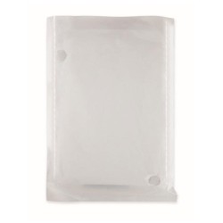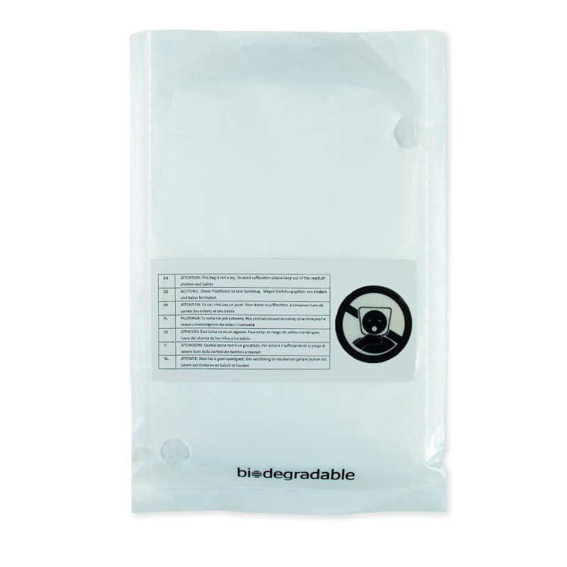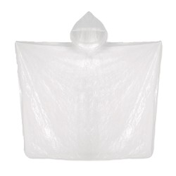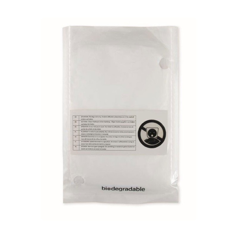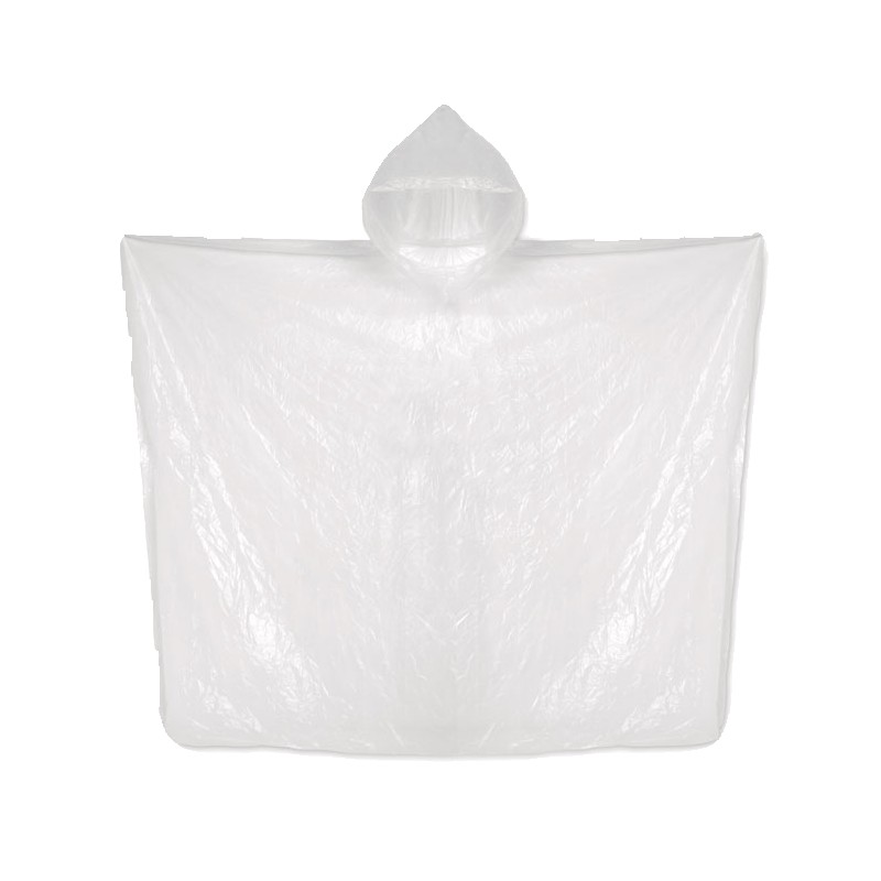 Poncho pliable en matériau biodégradable et également emballé dans un sac biodégradable.