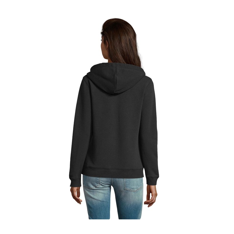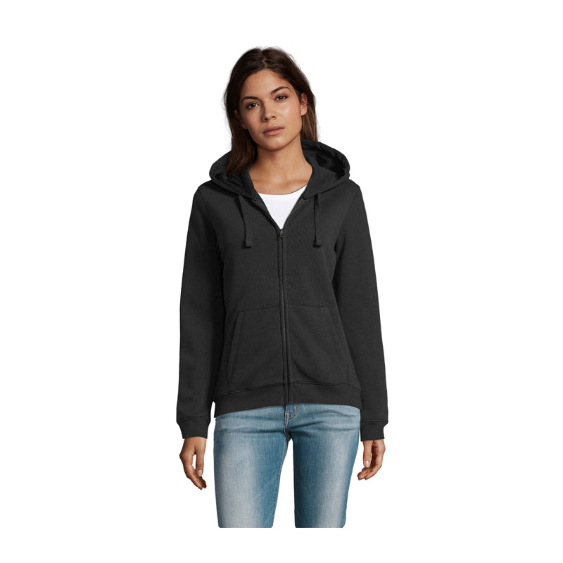 SOL'S SPIKE WOMEN. Veste zippée homme à capuche, 80% coton Ring spun- 20% polyester. Intérieur grate, Extérieur 100% coton Molleton 280 technologie LSF (low shrinkage fabric) Manches montées, 2 poches kangourou, Coupé cousu, Capuche doublée avec cordon de serrage ton sur ton, Poignets et bas en bord côte 2x2, Demi-lune à l'intérieur du col, Bande de propreté intérieur col. Zip YKK. OEKO-TEX®. Vendu uniquement avec impression.
