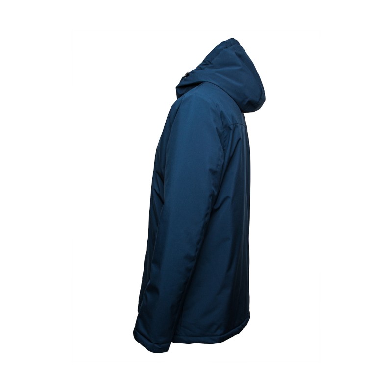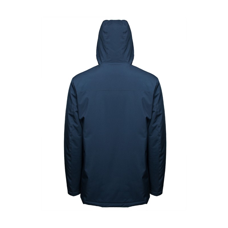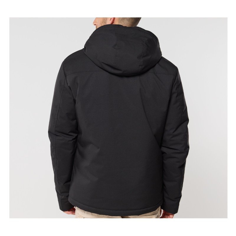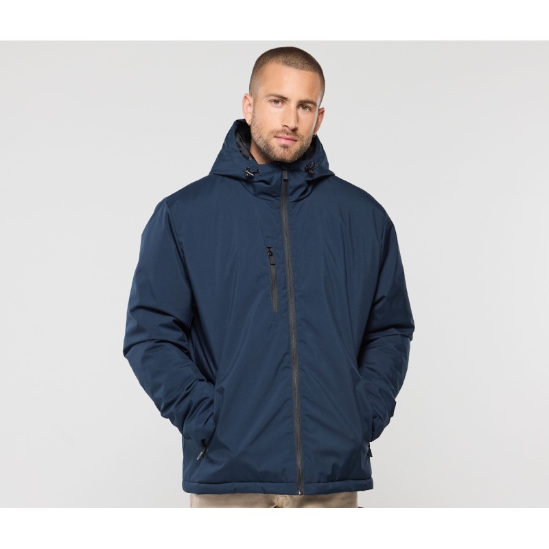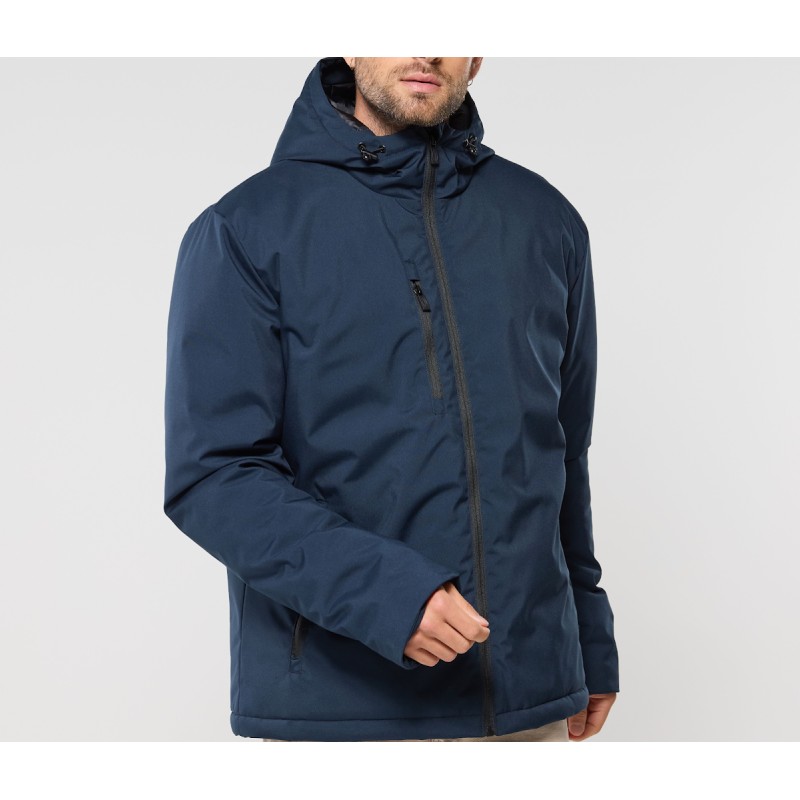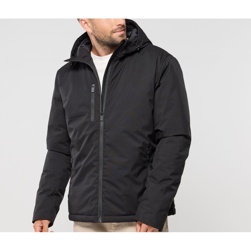 Ouatine recyclée. Accès marquage dos et poitrine. Zip inversé. 2 poches zippées. Capuche préformées 3 panneaux. Poche intérieure zippée.