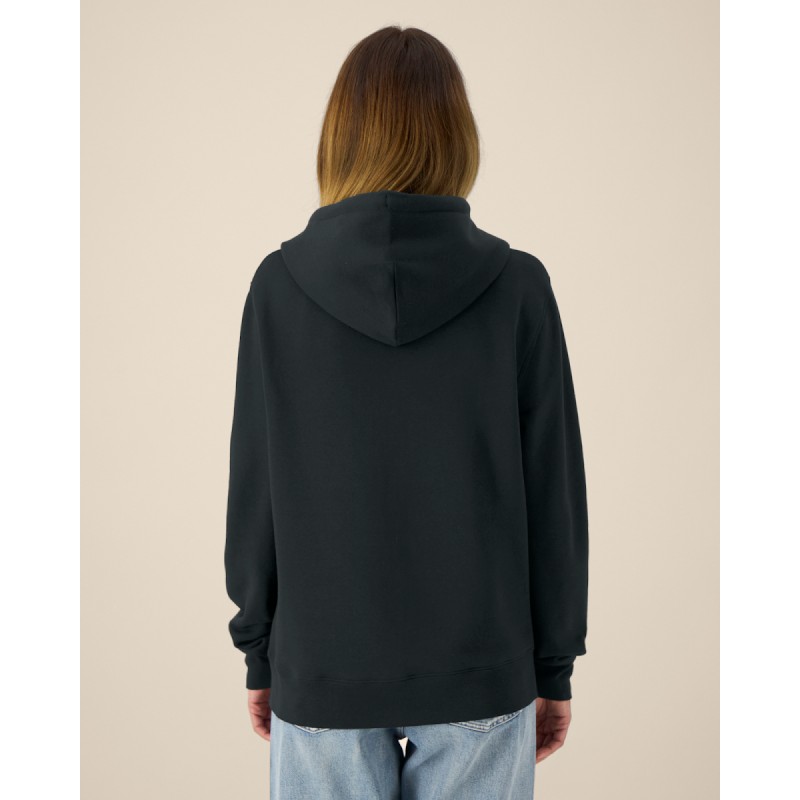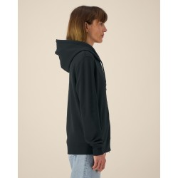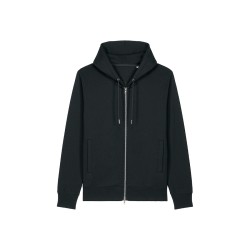 Capuche doublée dans la matière principale Cordon de serrage rond ton sur ton avec embouts en métal Œillets métalliques Bande de propreté en chevron Demi-lune dans la matière principale au dos du col Zip double curseur milieu devant Manches montées Poches passepoilées Côte 1x1 au bas de manches et bas de corps