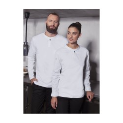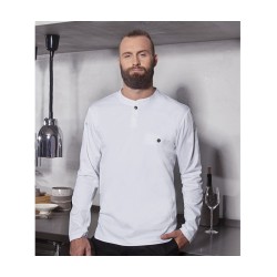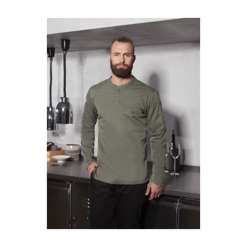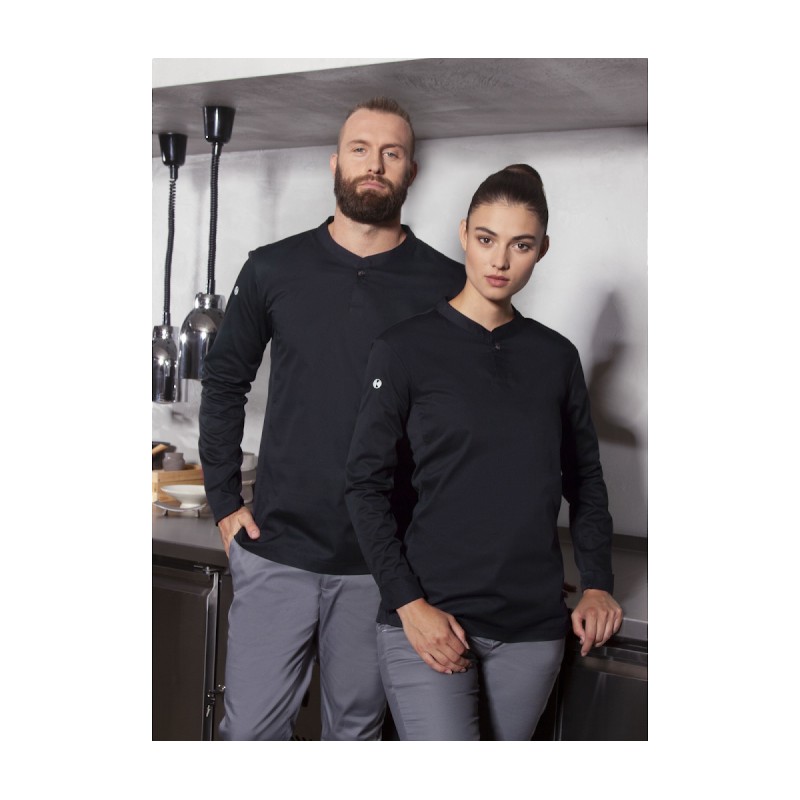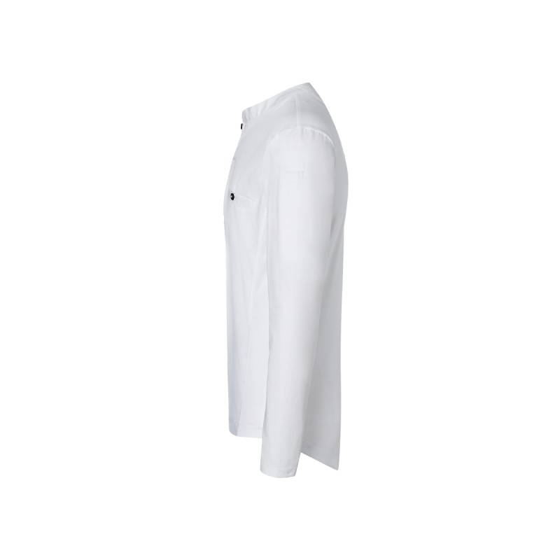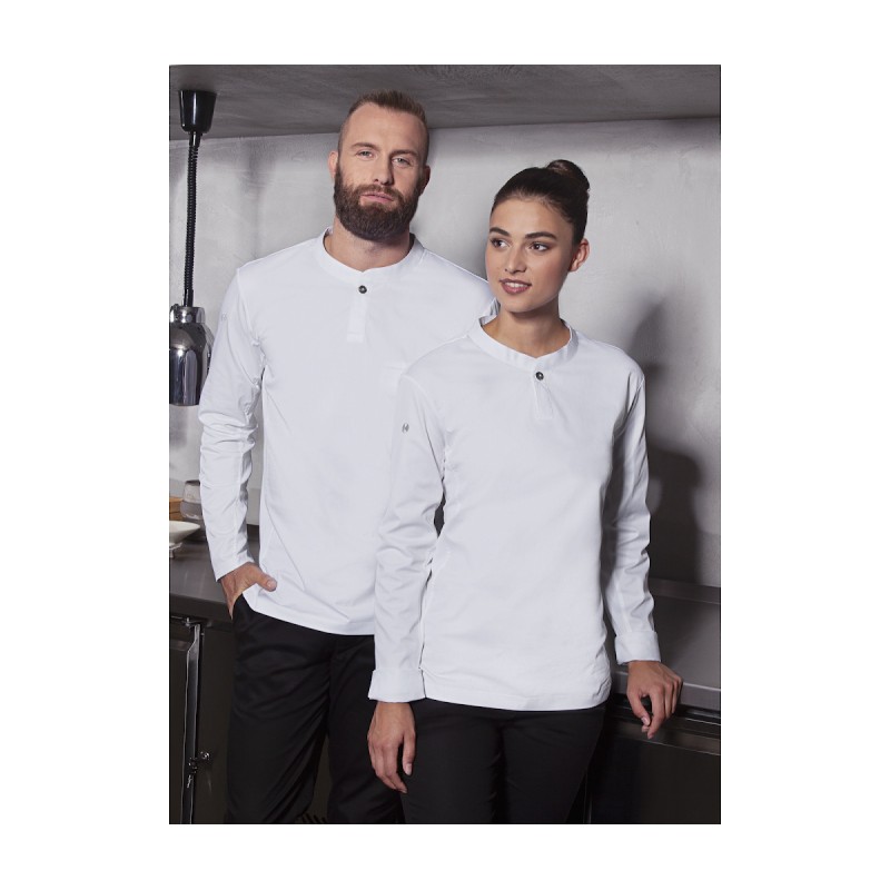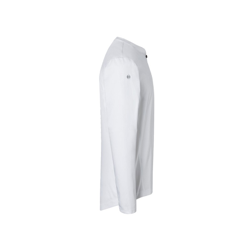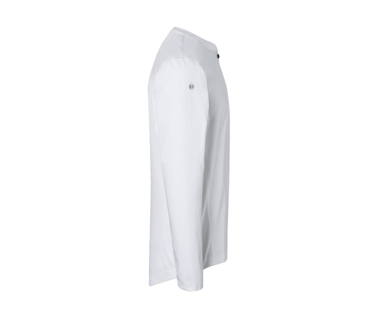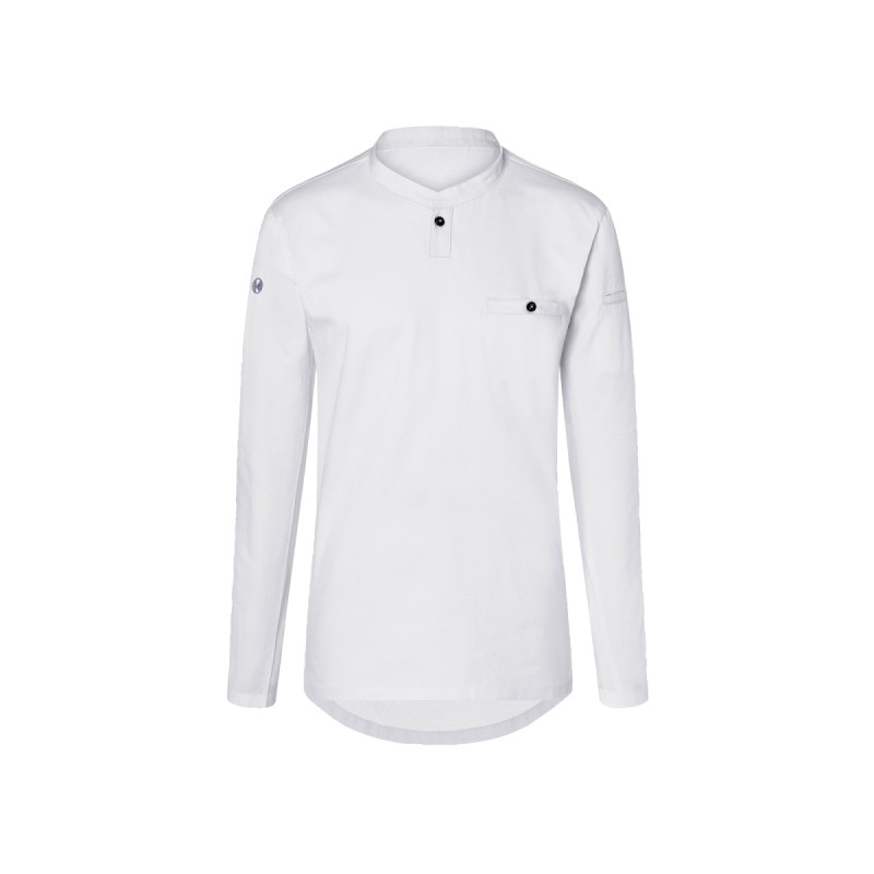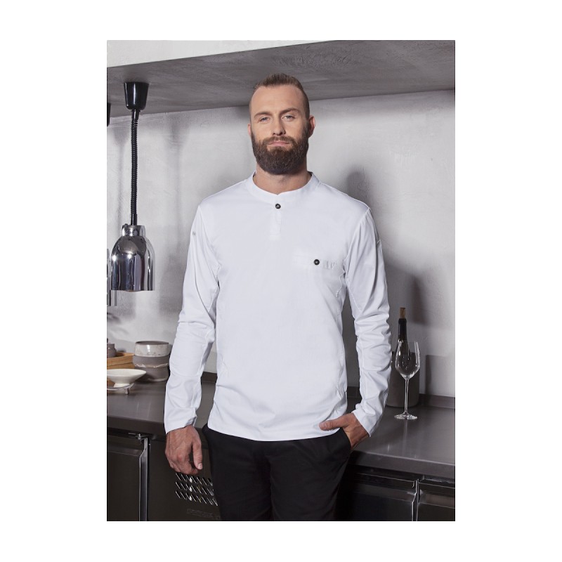 Respirant. Convient aux domaines suivants : cuisine, service, nettoyage, soins, bien-être… Col officier avec boutonnière. Poche passepoilée à la poitrine et sur la manche gauche.