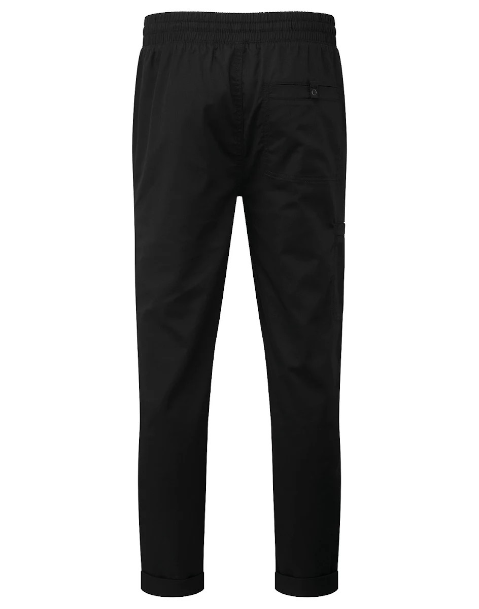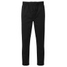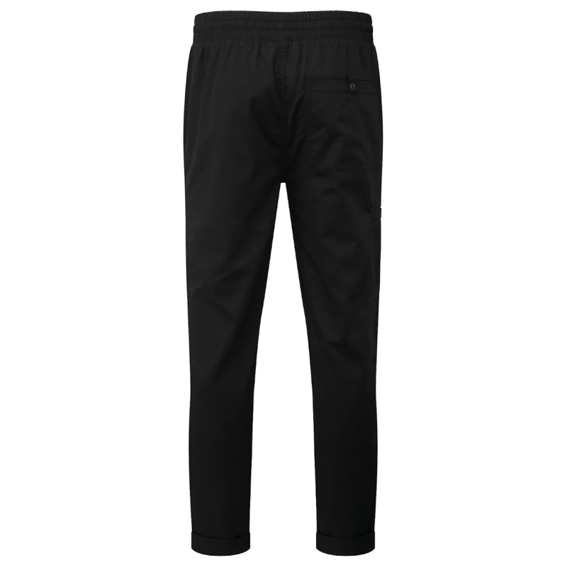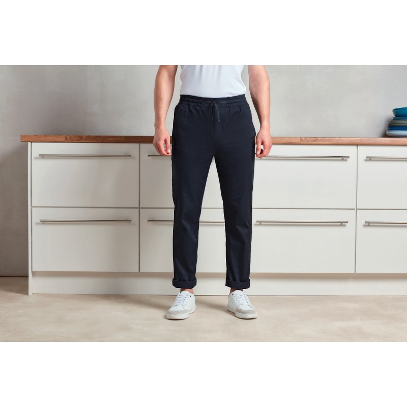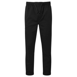 65% polyester recyclé / 35% coton. Taille élastique et cordon de serrage. Braguette à fausse couture. Bas de jambe fuselé avec ourlets retroussés.
