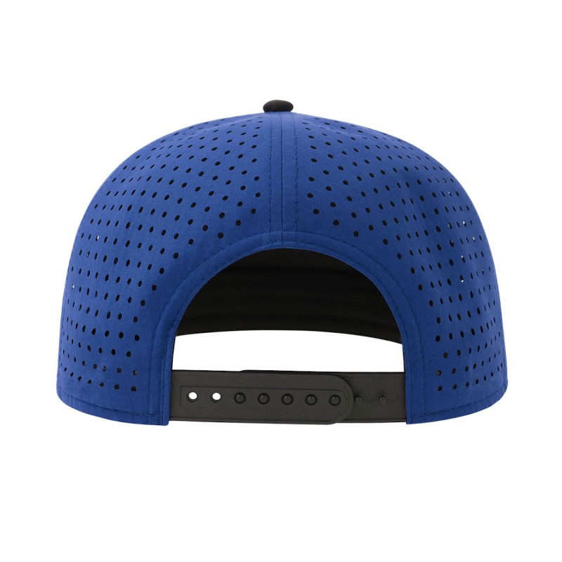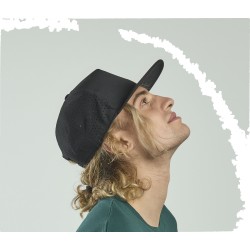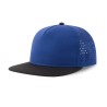Structured streetwear hat made of recycled polyester microfiber and recycled polyester twill on bill. 5 panels shape and flat visor. Fine lasered holes on side and back.