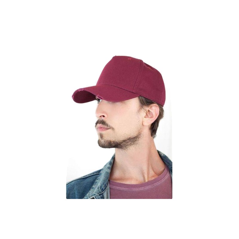 Avec son style déstructuré et son tissu 100% coton chino, la casquette à 5 panneaux CARGO a de multiples usages : du monde de la mode à la musique en passant par le « street style ».. 5 PANNEAUX, Cotton, VISOR CURVED, Destroyed, oeillets surpiqués, FERMETURE AVEC BOUCLE METAL, Délavé. Main fabric: 100% coton