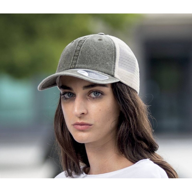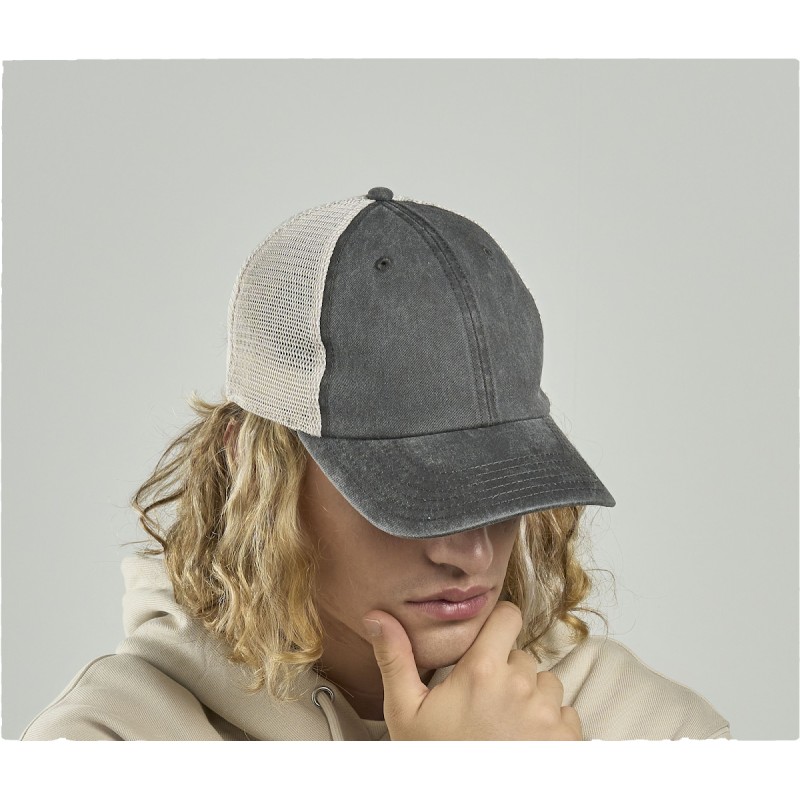 Le style casual et vintage rencontre la célèbre forme de la casquette trucker.. Trucker Cap, Cotton, MID VISOR, oeillets surpiqués, 8 COUTURES SUR LA VISIERE. Main fabric: 100% coton_x000D_