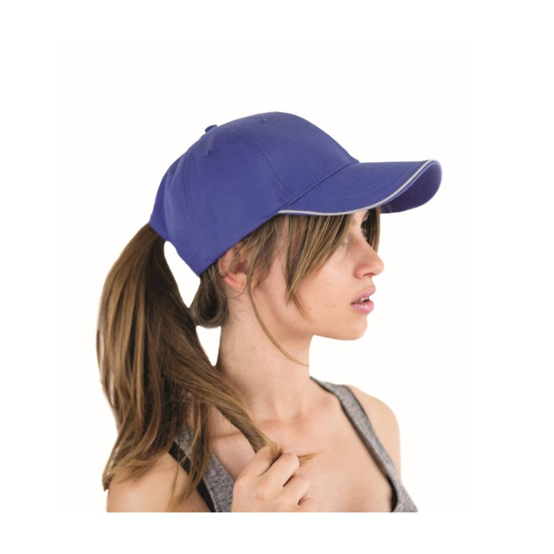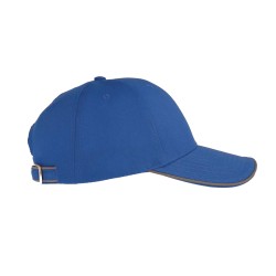 Fermeture avec patte de réglage en tissu et Velcro.. 6 PANNEAUX, Cotton, VISOR CURVED, oeillets surpiqués, FERMETURE AVEC BOUCLE ET OEILLET BRODE', 6 COUTURES SUR LA VISIERE. Main fabric: 65% polyester - 35% coton
