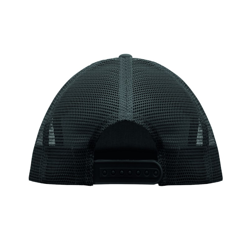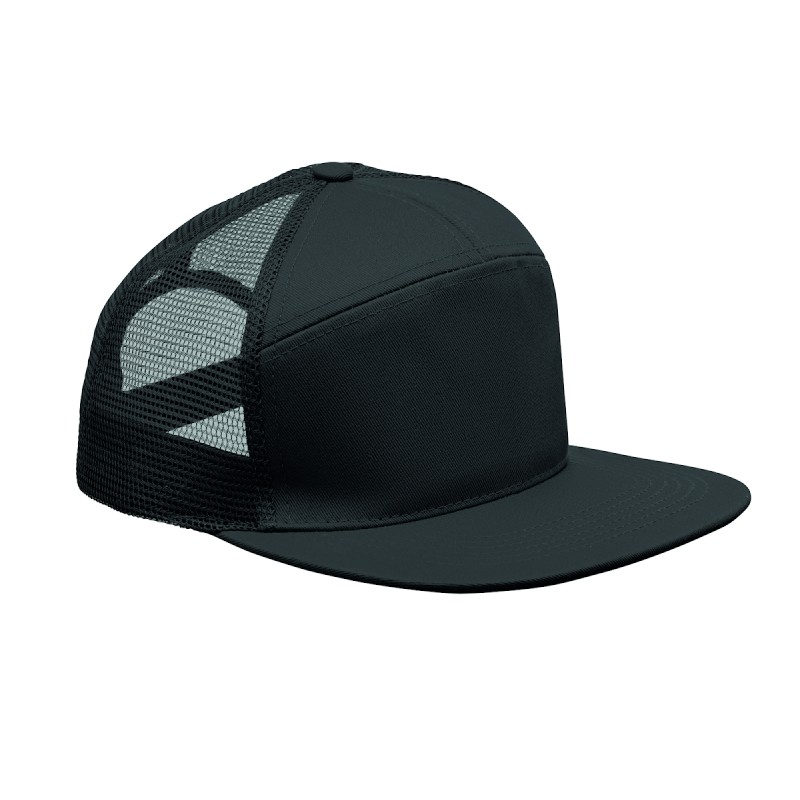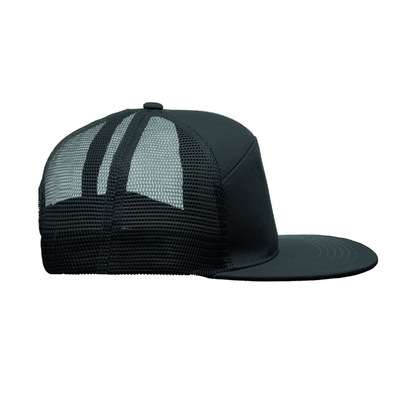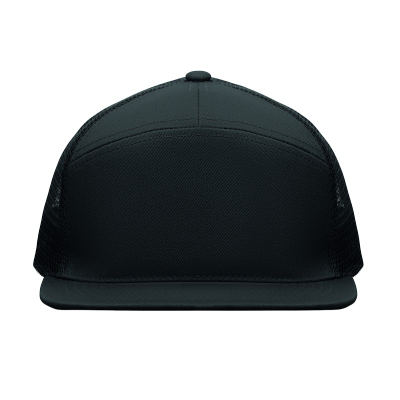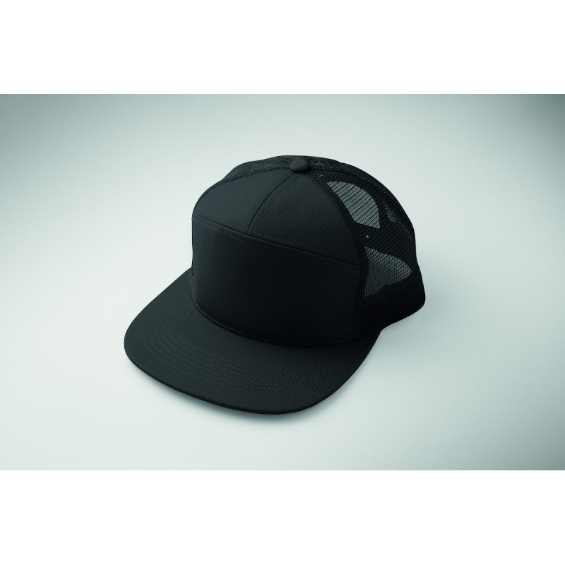 Casquette à visière plate à 7 panneaux en sergé de coton avec maille en polyester à l'arrière et fermeture en plastique.
