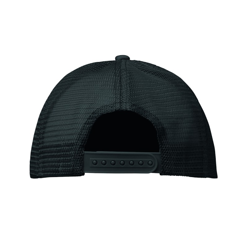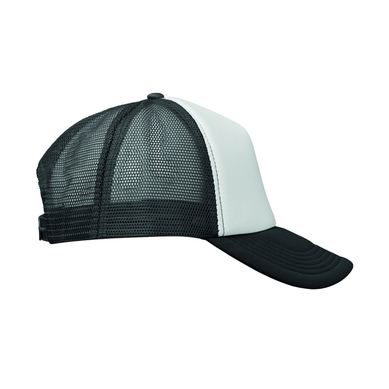 Casquette 5 pans en polyester 140-150 gr/m2 fermeture par claquement. Panneau frontal et visière en jersey polyester doublé. 4 pans en filet de couleur. Taille 7 1/4.