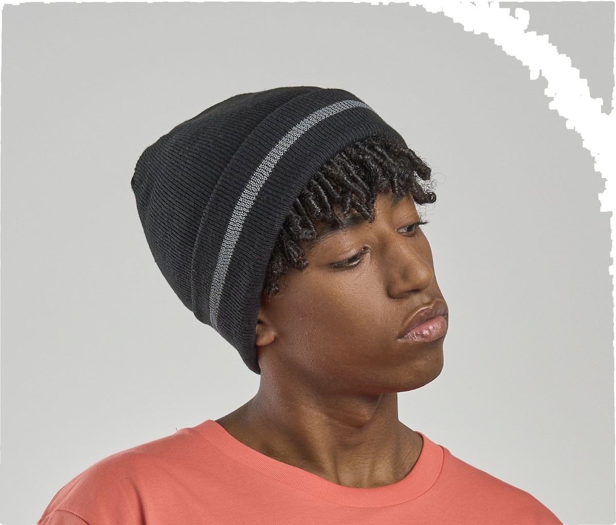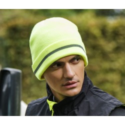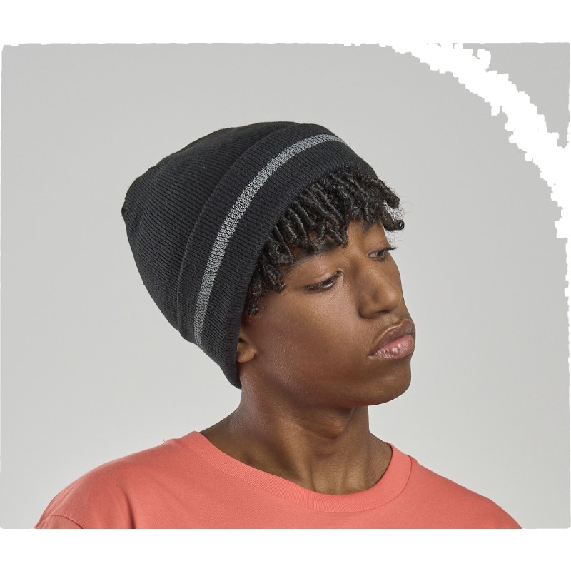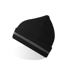 Beanie on cuff made of recycled polyester yarn. Soft hand feel, double layer of fabric and flat machine finish. Reflective band on cuff for high visibility.