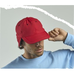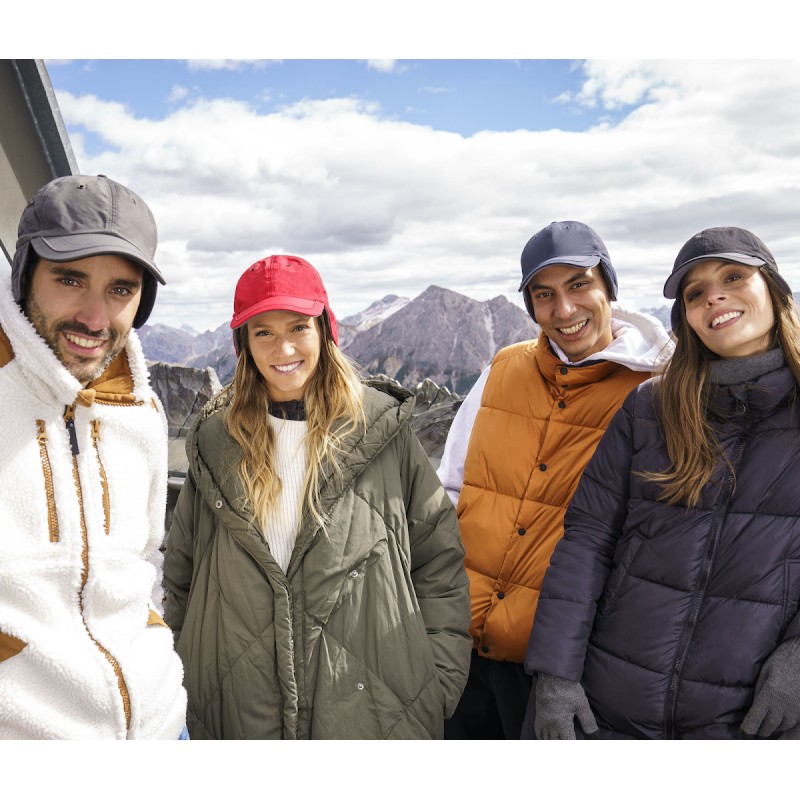 Outdoor winter hat with ear flaps made of recycled nylon. Water repellent outside and recycled polar fleece inside. Unstructured front panels and curved visor. Adjustable closure with elastic drawstrings and stopper.